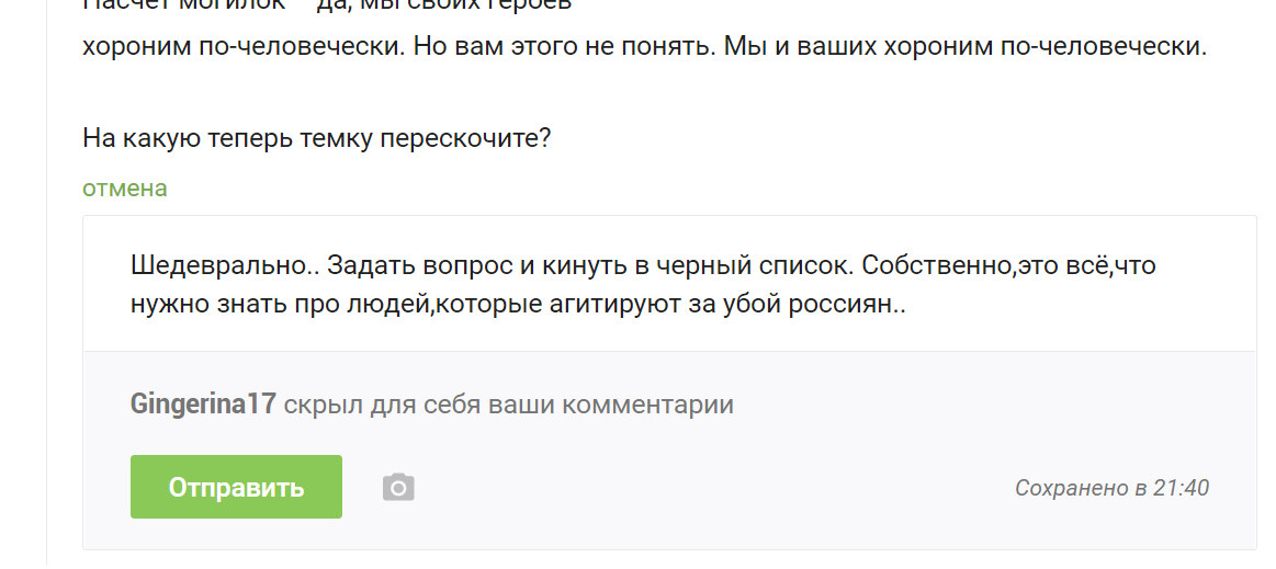 Шедеврально.. Задать вопрос и кинуть в черный список. Собственно,это всё,что нужно знать про людей,которые агитируют за убой россиян..