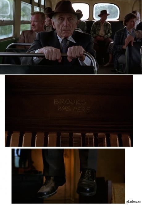 Да уж... Персонаж и его судьба действительно запоминающиеся. По сути прожил всю жизнь в тюрьме, знал там все как свои 5 пальцев. Был на своем месте. А когда его освобождали он не радовался,а даже расстороился. И по сути на свободе он никому не был нужен: родные умерли, детей нет. И вот он 70 летний старик, без жилья, денег, просто доживает свой век... одинокий. И эта выцарапанная надпись над дверью, по сути единственное что от него осталось. Печально это все...