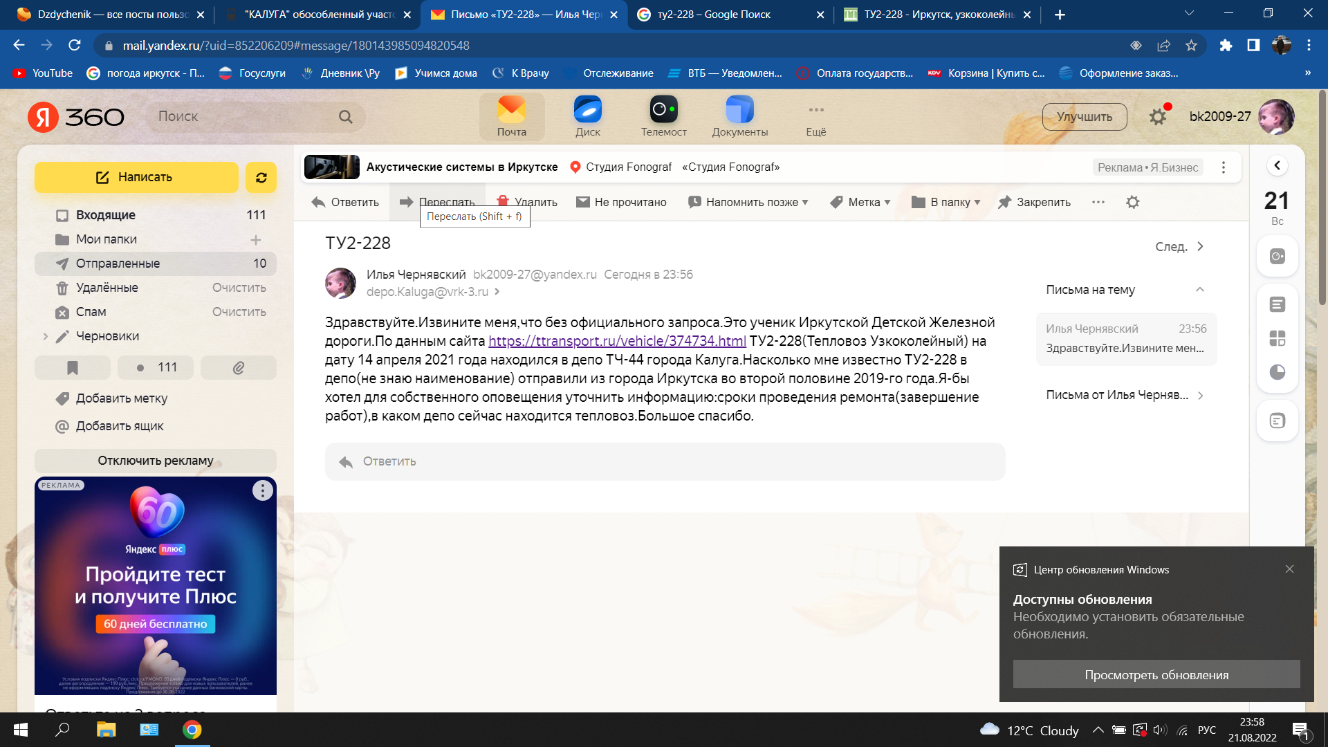 Вот такой запрос я отправил на электронный ящик по делу пропавшего тепловоза.