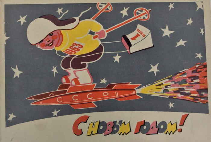 Вот эта последняя открытка необычна. Автором почтовой миниатюры является эстонская художница Аста Юлиусовна Вердер. Советская открытка, как правило, отражает реалии времени. Появление образа юной покорительницы космоса неслучайно. Открытка напечатана в 1963 году, в год полета в космос первой женщины Валентины Терешковой. Поэтому образ "Девочки Нового года" в шлеме космонавта - это аллюзия на важное событие.
