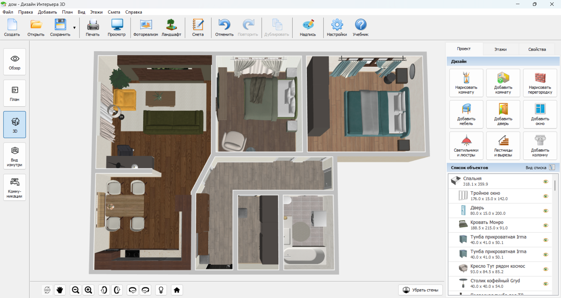 Раньше мы действовали интуитивно: просто двигали диван туда-сюда, пытаясь угадать, как правильно поставить мебель в зале. Это отнимало кучу сил и времени, а результат все равно не нравился. Чтобы сберечь спины и нервы, мы решили сначала все отрисовать. Я использовала программу Дизайн Интерьера 3D: это гораздо проще и нагляднее, чем чертить на бумажке. Когда видишь комнату сверху и в объеме, сразу понимаешь, где будет тесно, а где пусто.