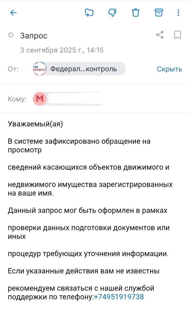 Сегодня на электронную почту пришло письмо (странно, что не отлетело в спам, обычно фильтры отрабатывают нормально), якобы в Госуслугах зафиксированы некие действия. Перечитала, поняла, что мошенники. В иконке отправителя использовано лого Госуслуг, что в совокупности с содержимым вполне может ввести в заблуждение несведущего человека. Расчёт, видимо, на то, чтобы позвонили на указанный в письме телефон. Адрес отправителя не содержит никакого домена федеральных органов, а просто левая почта gmail (мошенники их, наверное, пачками авторегают).
