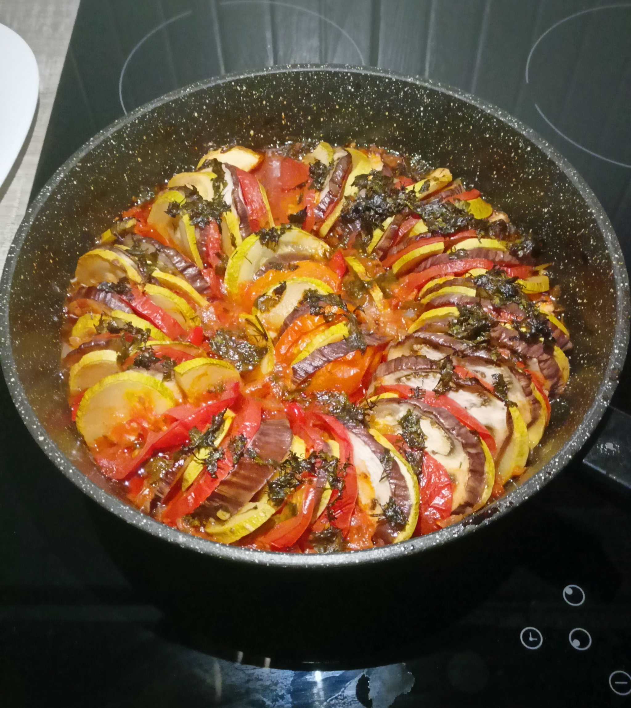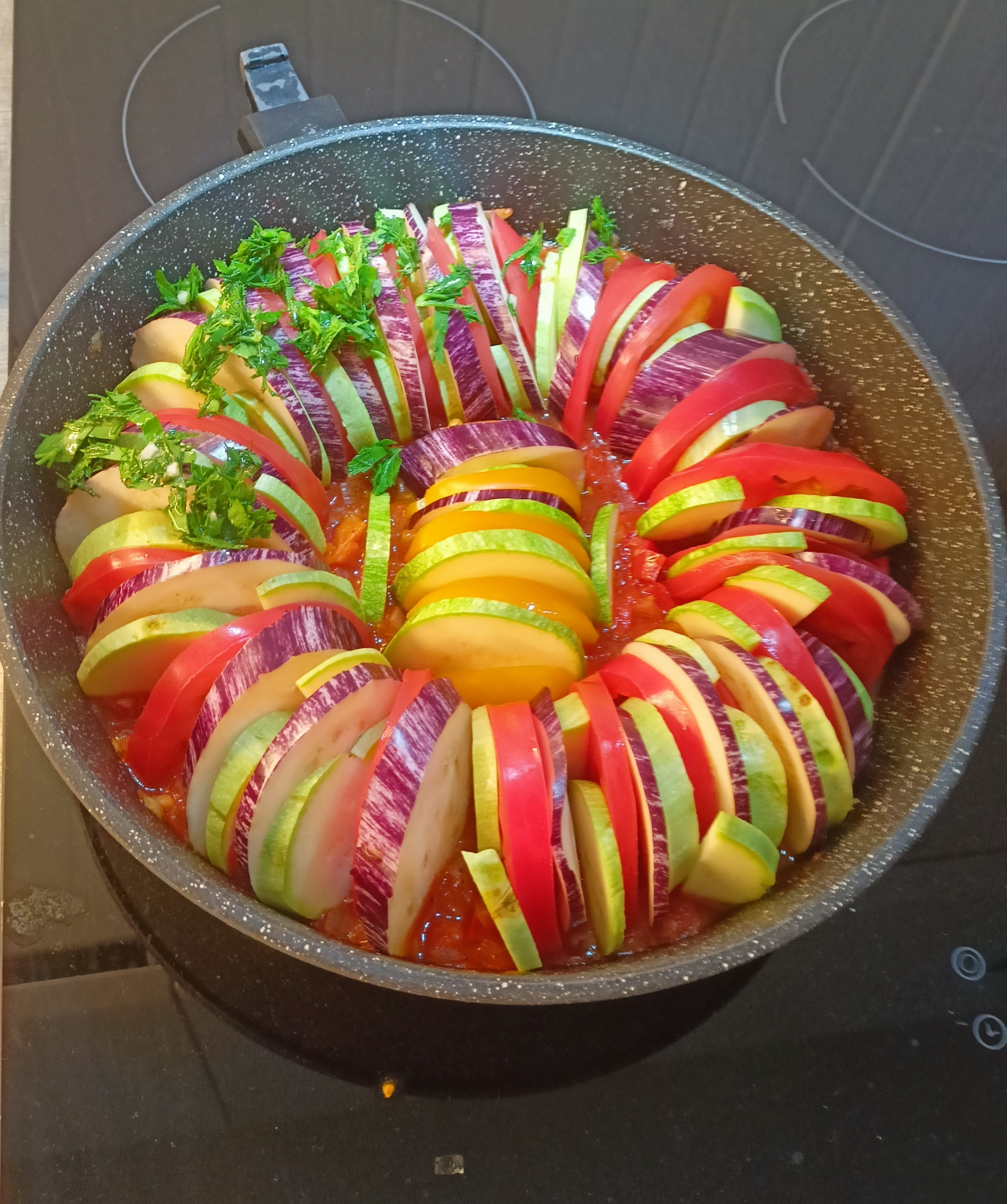 Порезанные овощи выкладываем друг за дружкой в соус. (У меня сковорода со съемной ручкой, так что я в ней же и буду запекать рататуй).