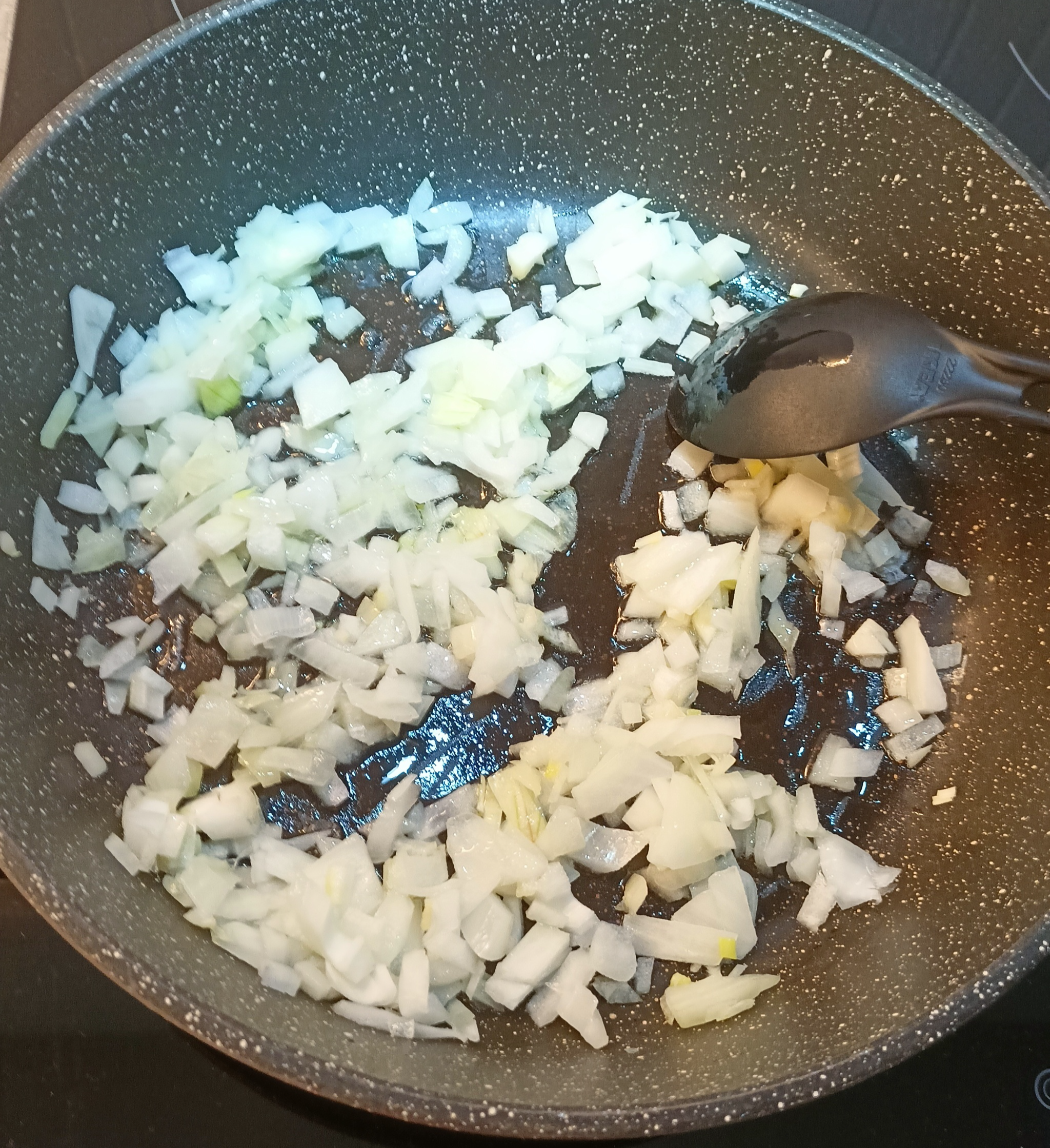 Разогреваем сковороду с маслом, режем лук мелким кубиком, обжариваем