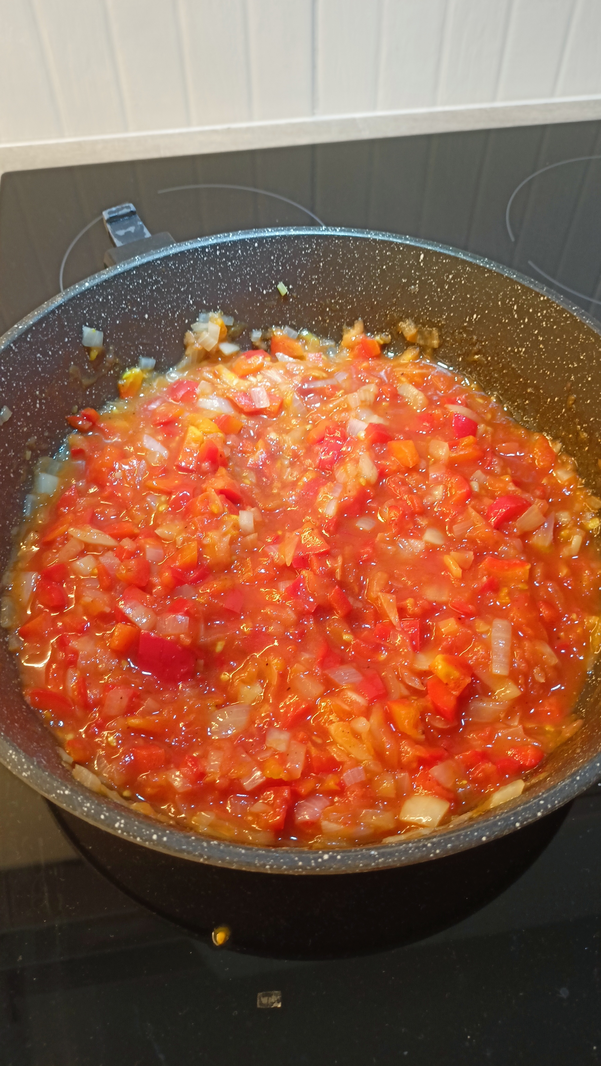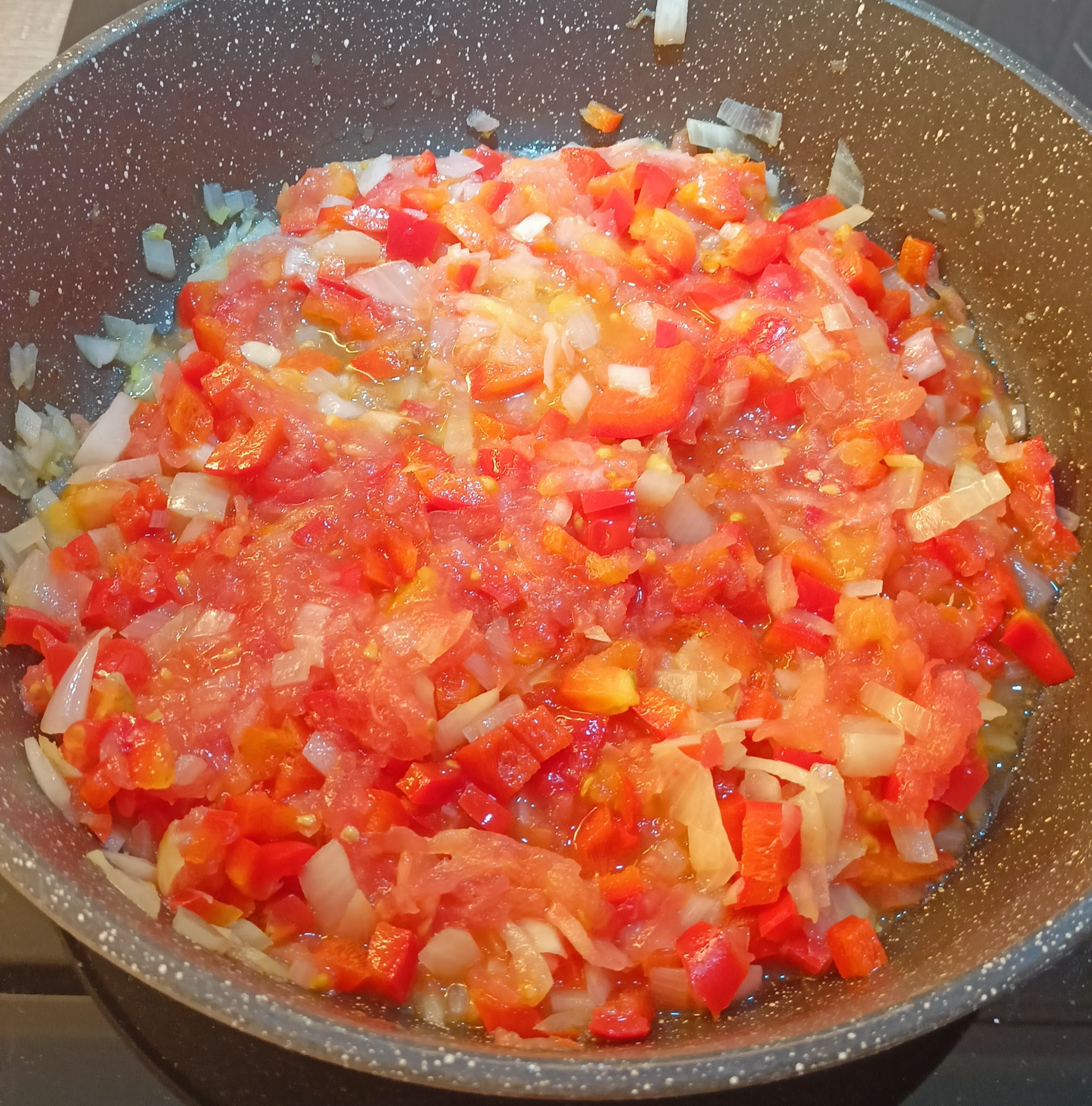 Пока лук и перец обжариваются, подготавливаем 2-3 средних помидора. Можно ошпарить, снять шкурку, а потом пробить в блендере. Но мне обычно лень так заморачиваться, так что я просто натираю помидоры на тёрке (шкурка остаётся в руке). Добавляю помидоры к луку и перцу. Обжариваю ещё 5 минут.