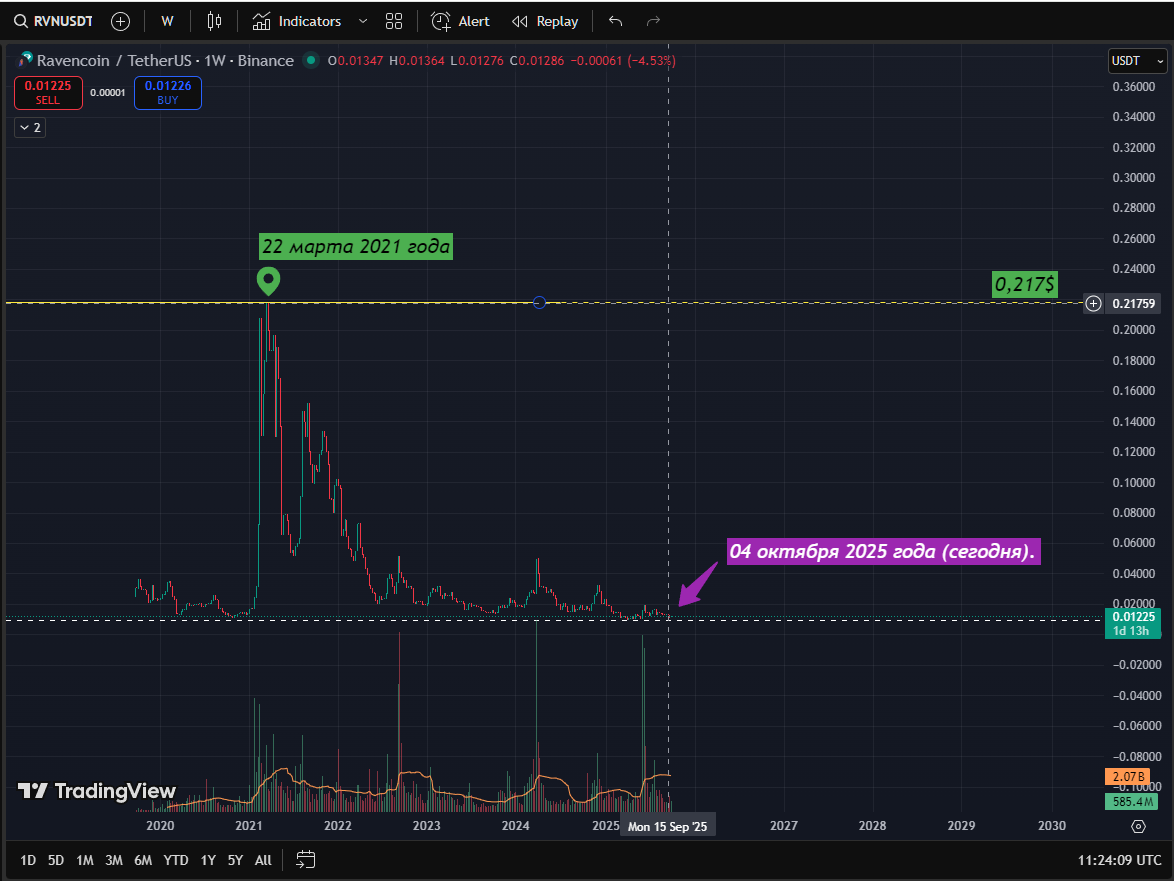 22 марта 2021 года максимальная стоимость монеты составляла 0,21$ или 16 рублей. Сегодня монета стоит 0,012$ или 0,96 копеек. По графику видим, что монета сейчас находится на самом дне и возможен рост. Но цена для покупки явно выгоднее чем по курсу 20 центов.