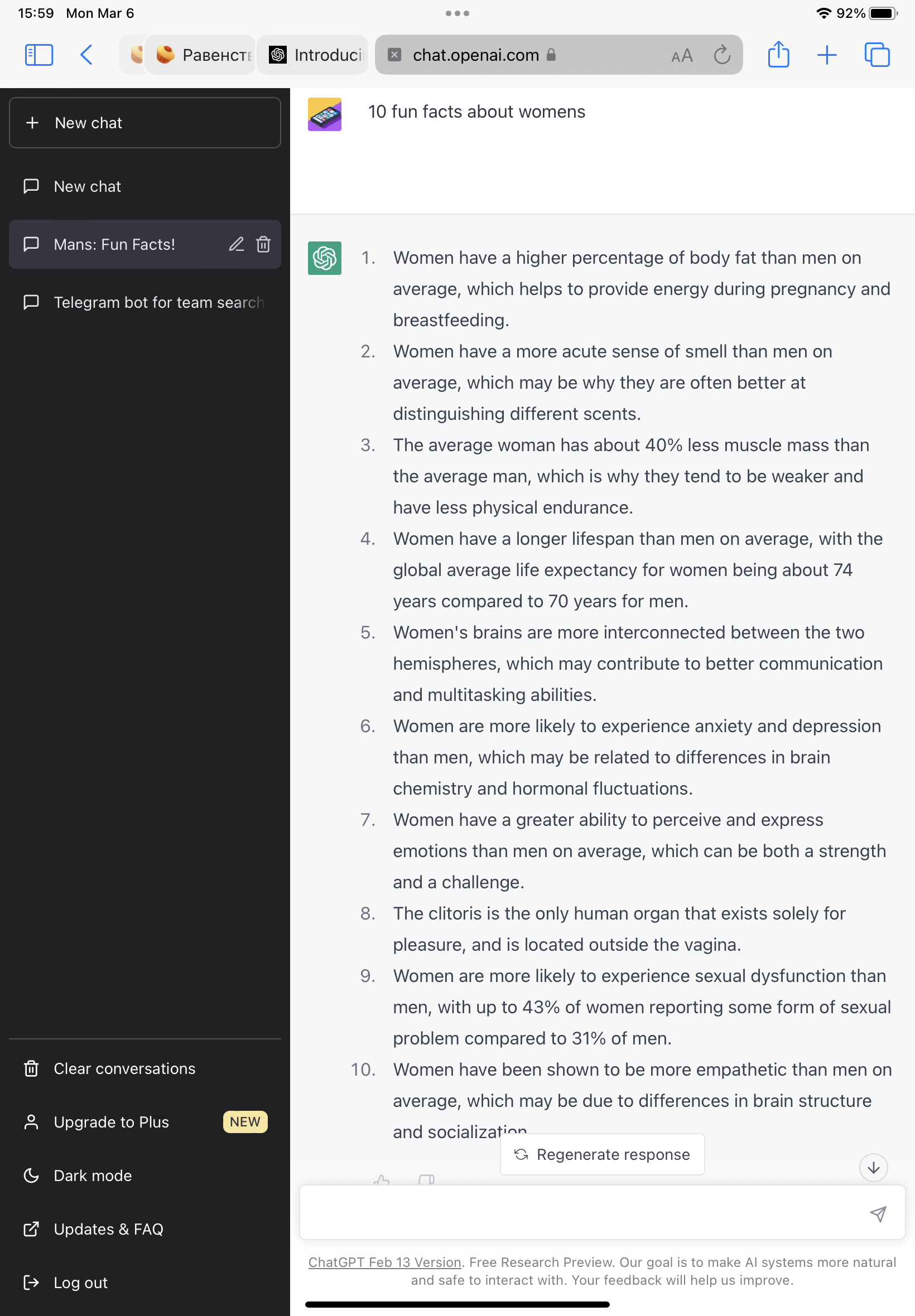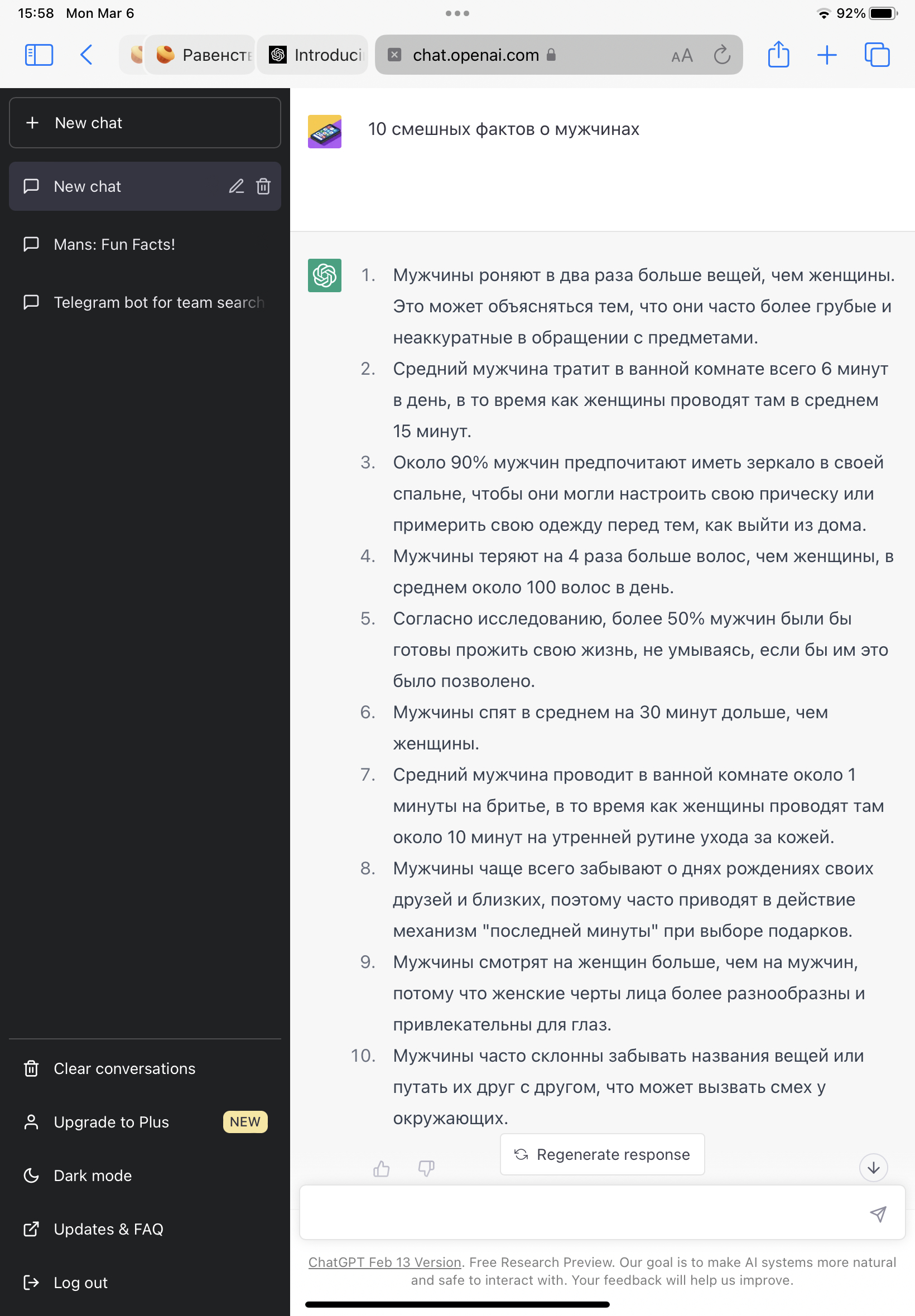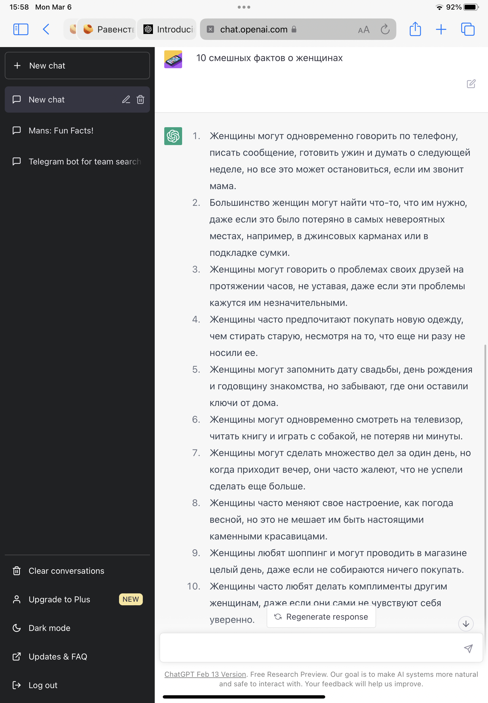 Не уверен, что в вашем боте в телеге актуальная версия ChatGPT или он там вообще есть. Зашёл через оф сайт, там ни на русском, не на английском не отказывается от запроса о смешных фактах о женщинах.