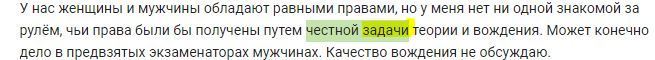 Graycie Равноправие по женски 5 лет назад У нас женщины и мужчины обладают равными правами, но у меня нет ни одной знакомой за рулём, чьи права были бы получены путем честной сдачи теории и вождения. Может конечно дело в предвзятых экзаменаторах мужчинах. Качество вождения не обсуждаю. [моё] Права женщин Водительские права Текст Ещё 0