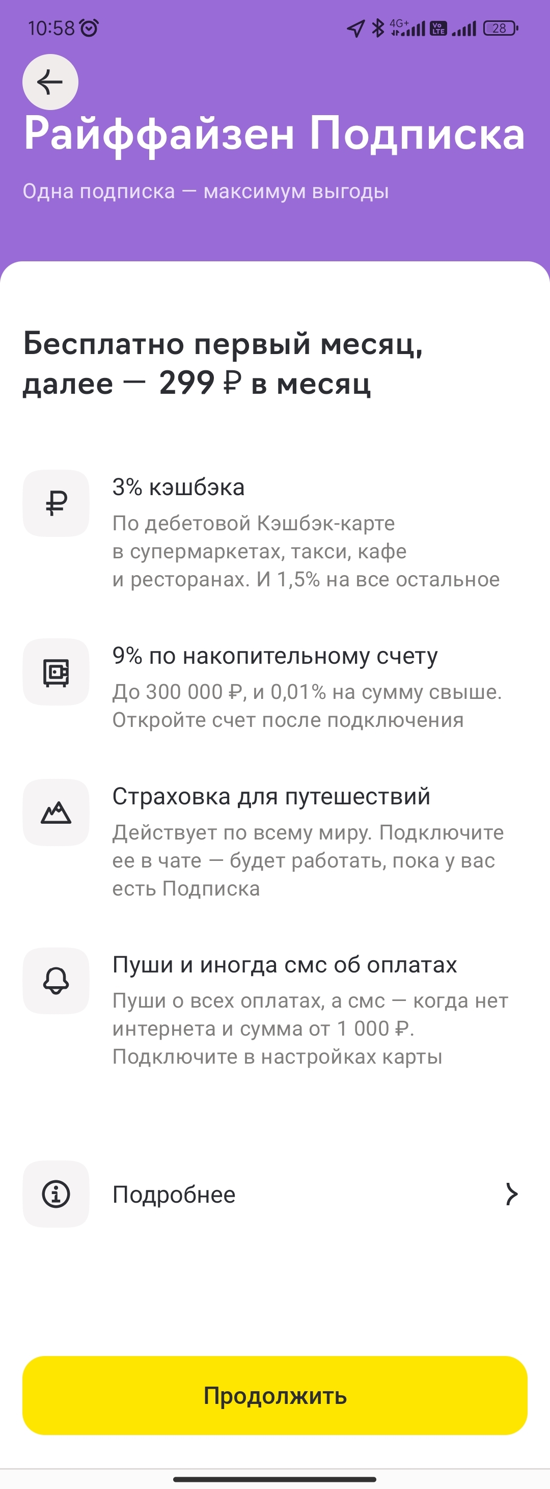 Некоторое время назад Райффайзенбанк представил новый продукт для держателей карт — называется он «Подписка». Для первого подключения предлагается месяц бесплатно, далее — 299 руб. /месяц.