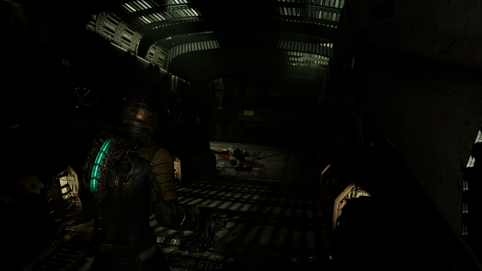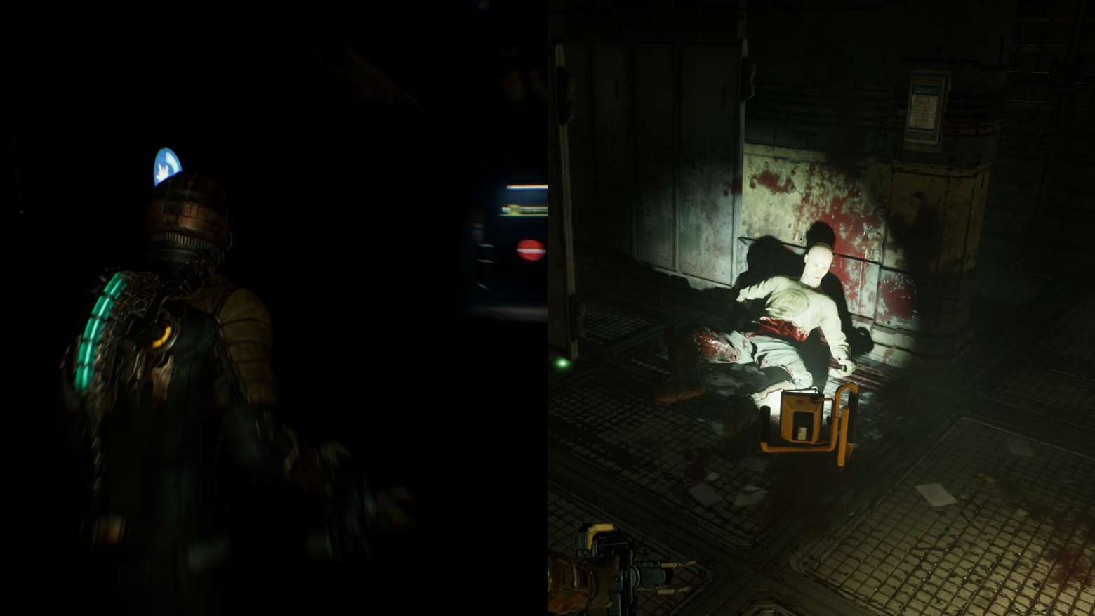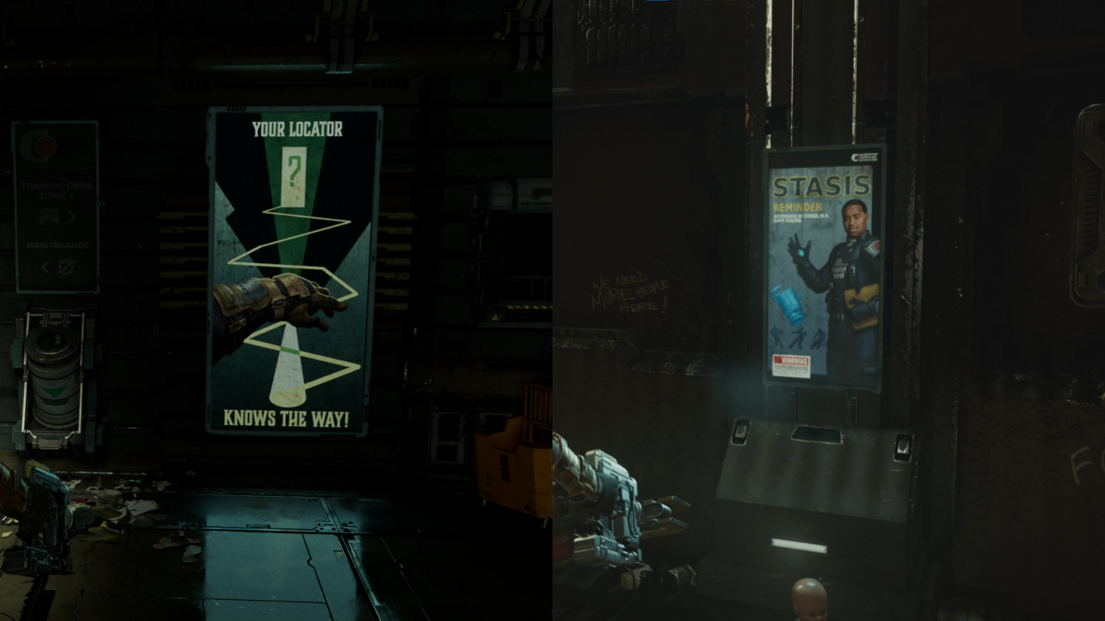 При достижении цели персонаж может воспользоваться впервые верстаком, где можно прокачивать героя. По возвращении обратно игроку предстоит сражаться с некроморфами. По прибытии на контрольную точку дизайнеры дают возможность передохнуть после долгих и напряженных сражений. На следующем пути игроку предоставляют новую механику стазиса. Получает герой это устройство, поднимая оторванную руку. Это тоже является одним из приемов вызова ужаса. Достигается с помощью различных неприятных зрелищ, например, как здесь - рука, с которой стекает кровь.