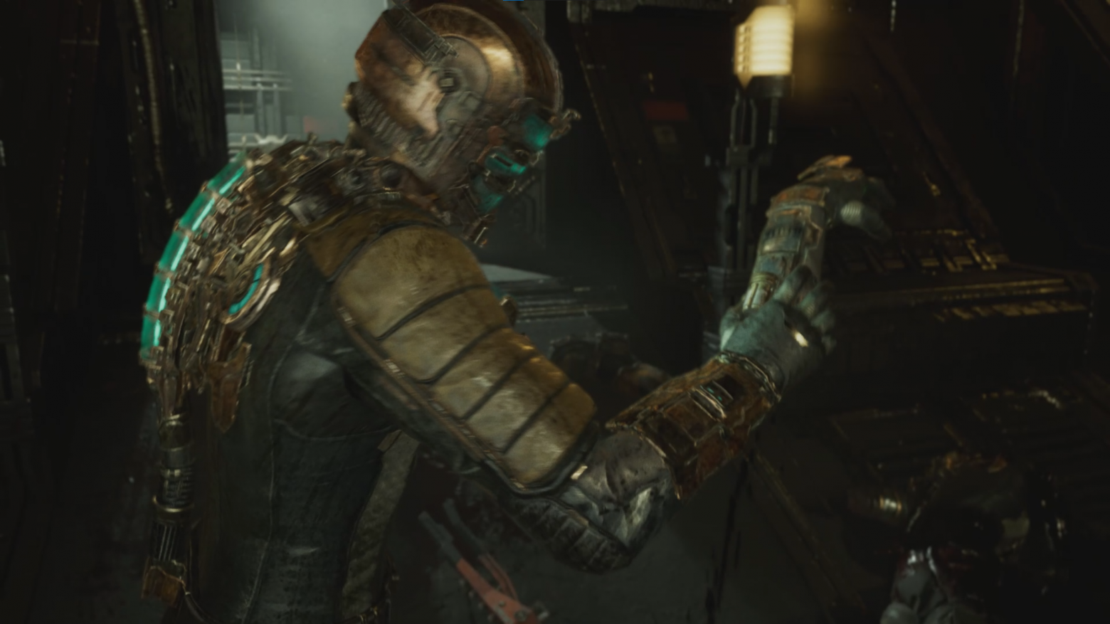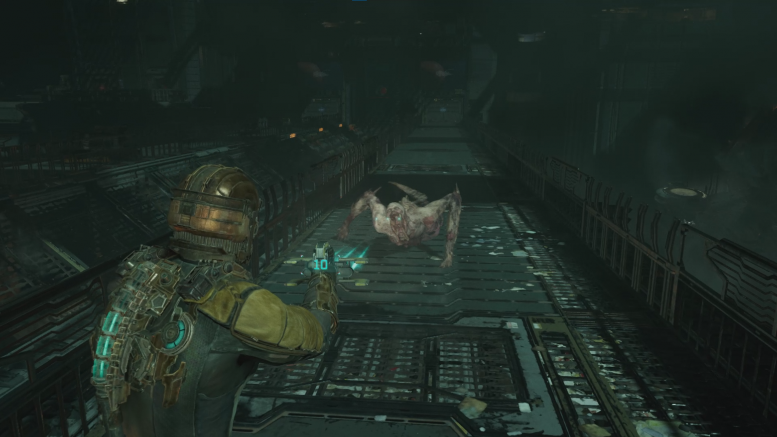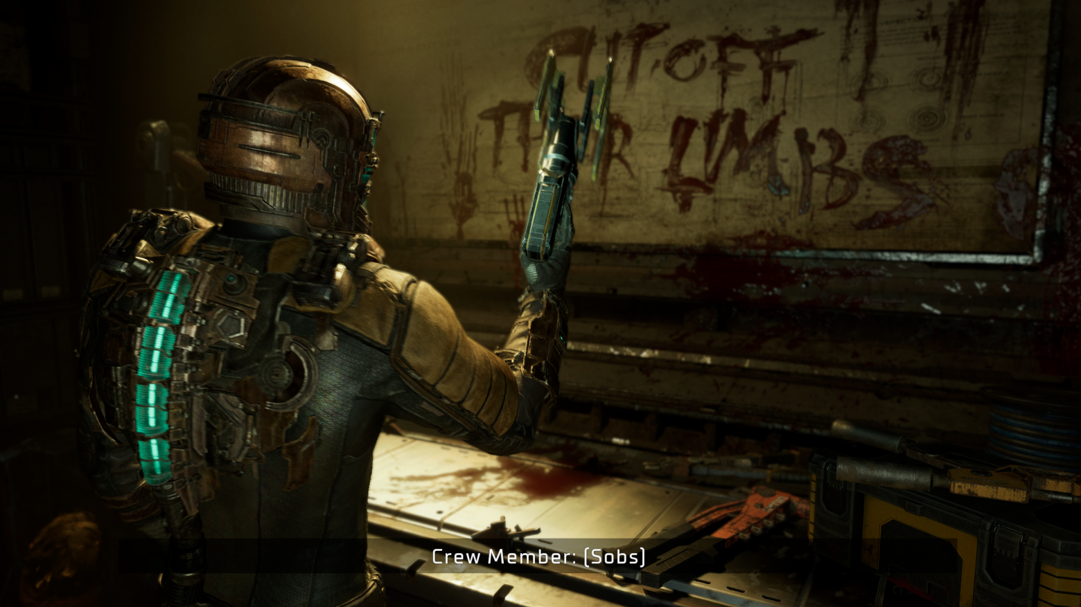 При достижении цели персонаж может воспользоваться впервые верстаком, где можно прокачивать героя. По возвращении обратно игроку предстоит сражаться с некроморфами. По прибытии на контрольную точку дизайнеры дают возможность передохнуть после долгих и напряженных сражений. На следующем пути игроку предоставляют новую механику стазиса. Получает герой это устройство, поднимая оторванную руку. Это тоже является одним из приемов вызова ужаса. Достигается с помощью различных неприятных зрелищ, например, как здесь - рука, с которой стекает кровь.
