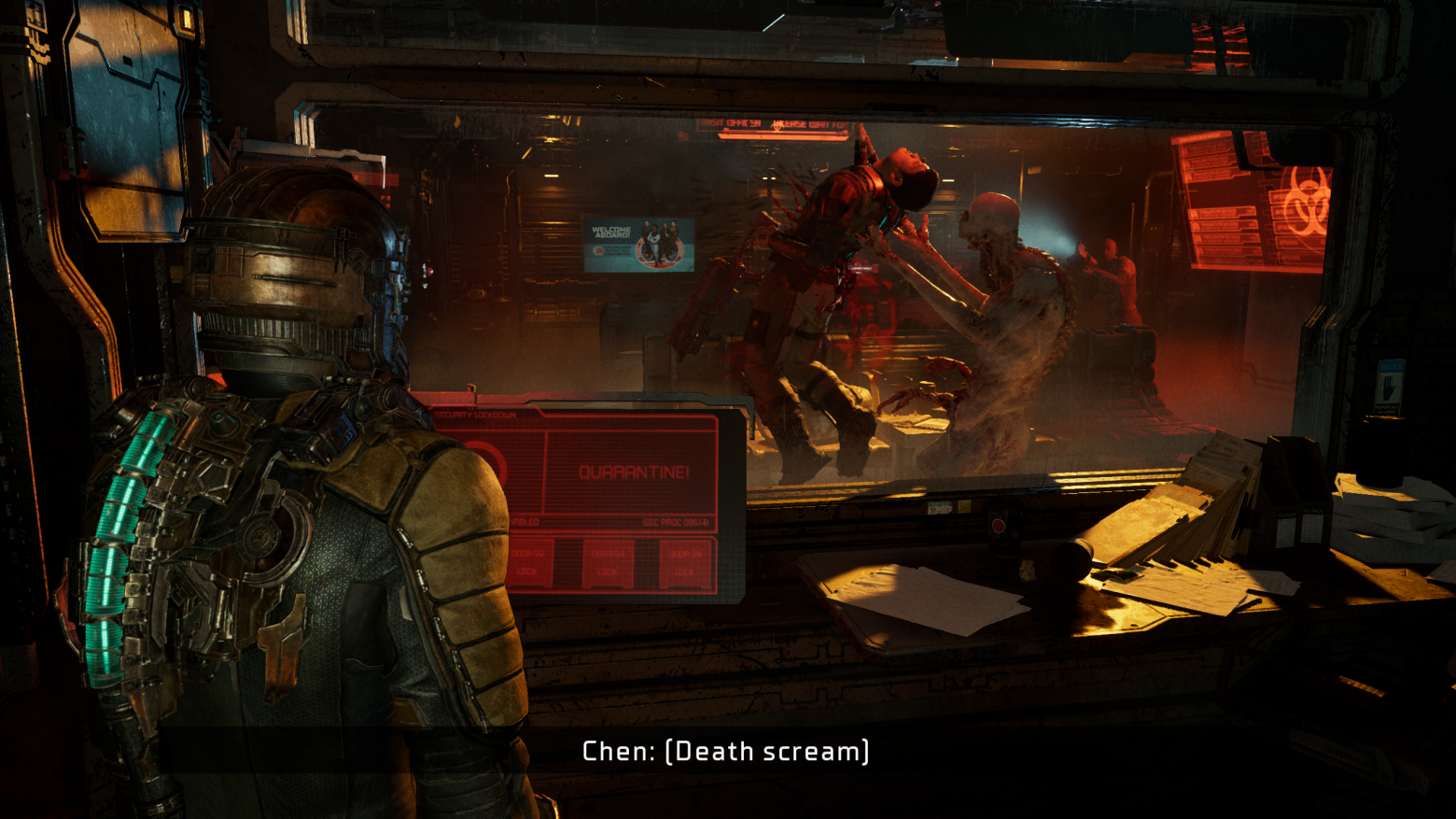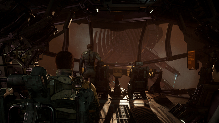 Дальше игрок заходит в комнату, где может заметить раскиданные повсюду чемоданы, бумагу. Это может натолкнуть на мысль о том, что кто-то спеша покидал данное помещение. Здесь же обучают игрока навигации, устройство, которое показывает полный путь до цели. После взаимодействия с панелью разработчики демонстрируют возможности и опасность первого противника, который убивает одного из союзников главного героя. Здесь демонстрируют, что подобные твари любят подкрадываться к своей жертве для устранения. Игрока заставляют бежать по узким коридорам, которые со всех сторон кишат опасностью. Игрок в этот момент бежит с одной лишь целью - спастись, убежать от некроморфов. По итогу персонаж попадает в лифт.