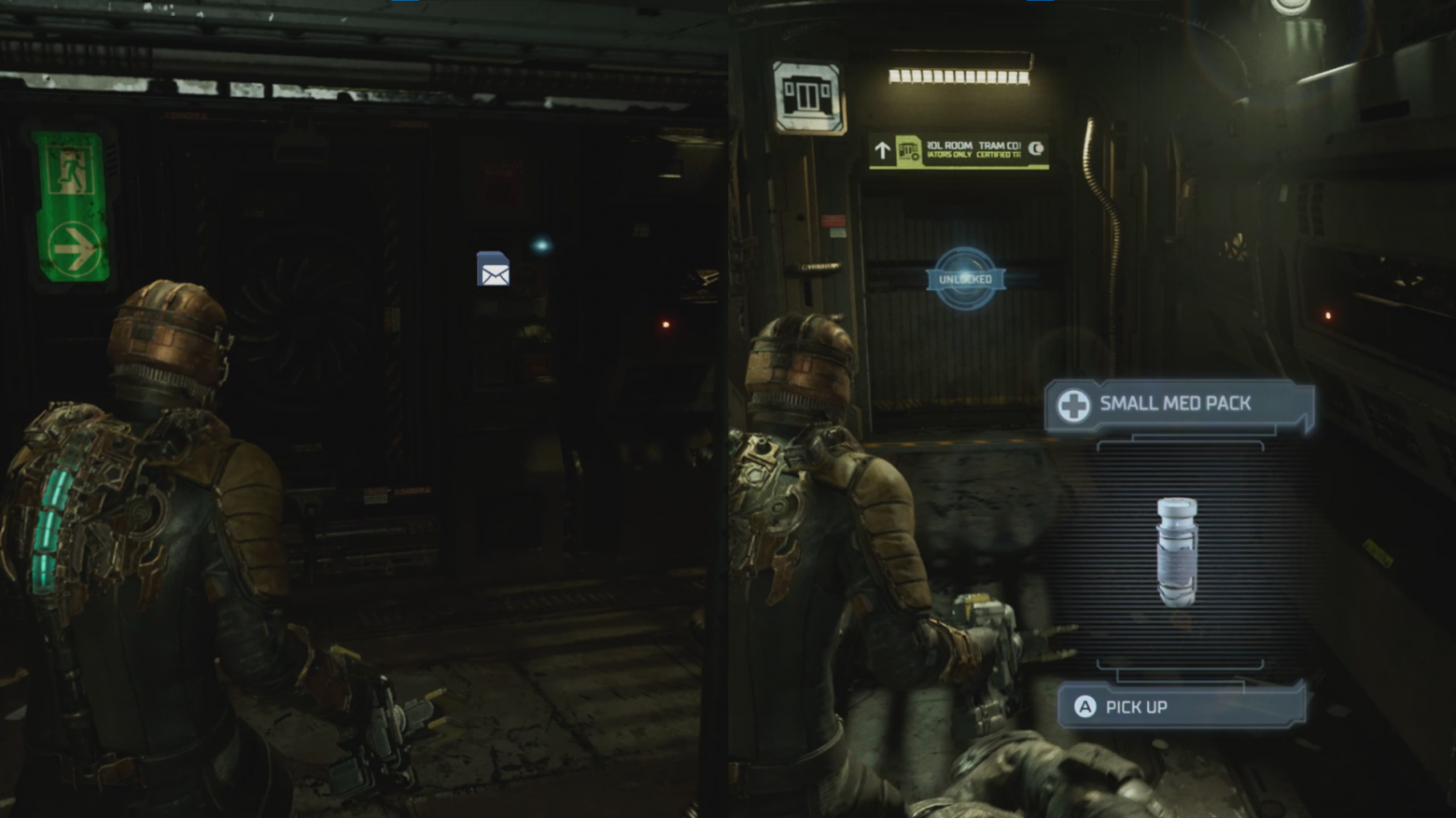 Далее разработчики все размещают так, чтобы игрок ничего не пропустил. Это база данных, которая дает информацию об обстановке на корабле, собирает все последующие туториалы. Также располагают первую аптечку, находящуюся у трупа. Таким образом пострадавший от первого противника игрок сможет повысить свое здоровье или же сохранить для будущих ситуаций у себя в инвентаре. Следующая комната является первой контрольной точкой в игре, где игрока встречают второй кат-сценой, где дают задачу игроку помочь союзникам попасть в вагонетку, и позволяют сохраниться.