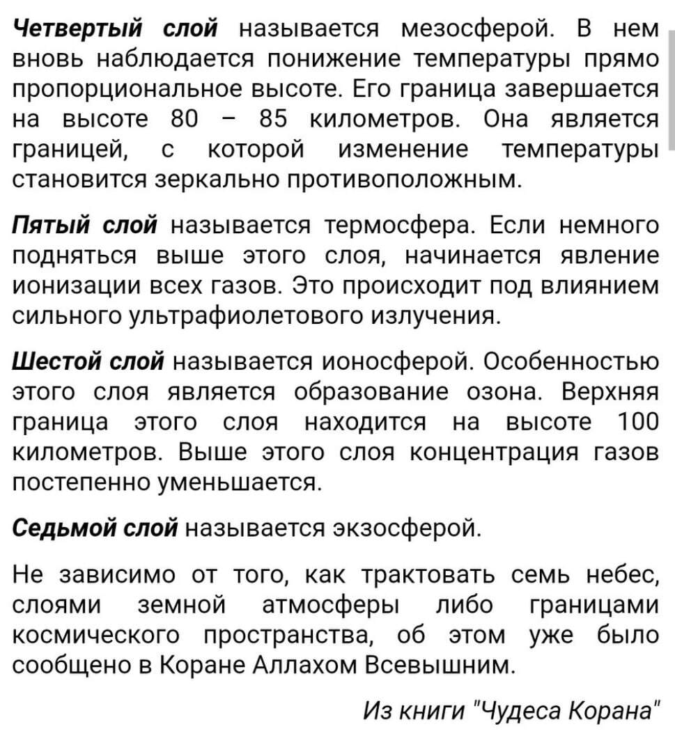 Что касается бреда про воздушную оболочку земли, луну и солнечную систему, а также планет в ней, то мне что-то и комментировать этот опус не хочется... Вообще, тактика хорошая. Состоит она в том, что надо найти то, что подходит под цифру 7(в данном случае), либо любую цифру, но наврать немного, совпадения найти и готово. Ну а что такого? Богоугодно же, Аллах не запрещал врать во благо религии, что с лицом, аметисты?