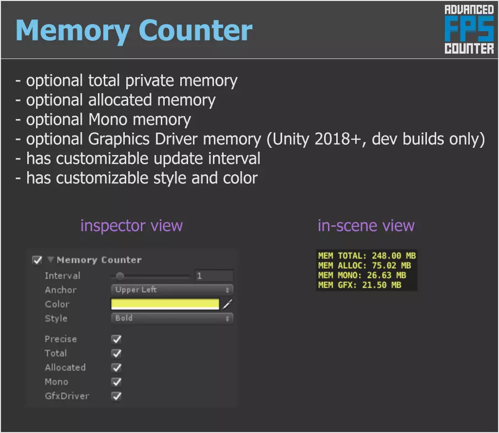 Использует графический интерфейс пользователя (uGUI) для рендеринга, но поддерживает полностью настраиваемый вывод через API, позволяющий считывать любое значение счетчика.