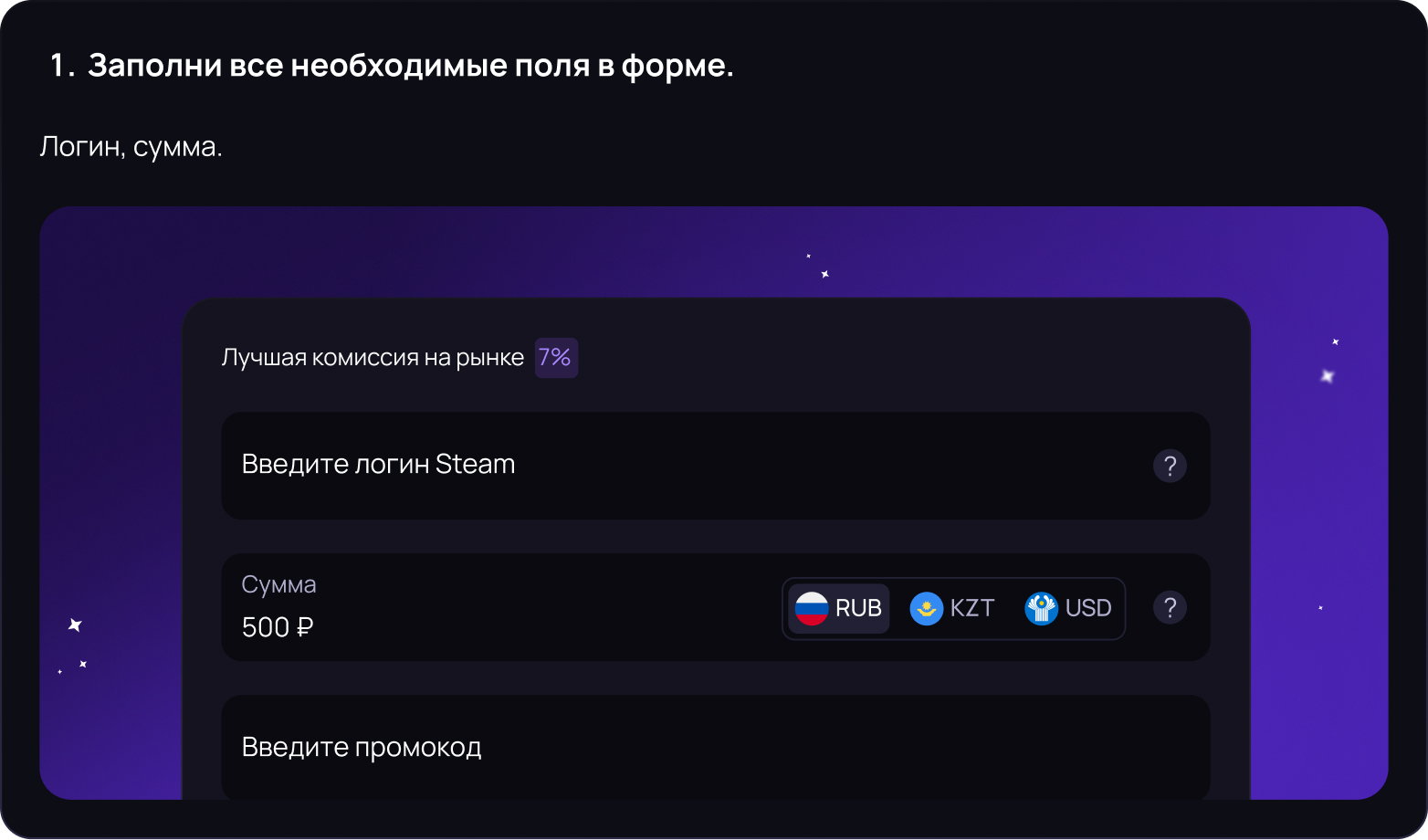 Вы всегда можете пополнить свой кошелек Steam через платформу Dessly, где это можно сделать быстро, качественно и с наименьшей комиссией!
