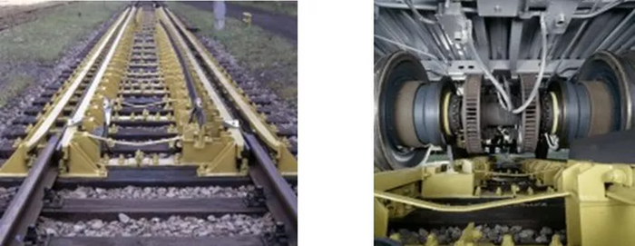 Технология перехода на двух стандартах колеи крайне проста – это 30-метровый участок рельсов, который постепенно меняет ширину колесной пары с помощью направляющих.