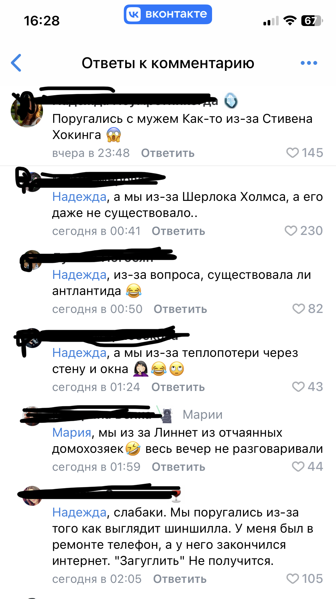 Я думала, только мой такой «уникальный», что мы разругались из-за свинины, пол ночи спорили из-за бывшей жены его начальника и чуть не подрались из-за того, что земля мокрая (рука-лицо).