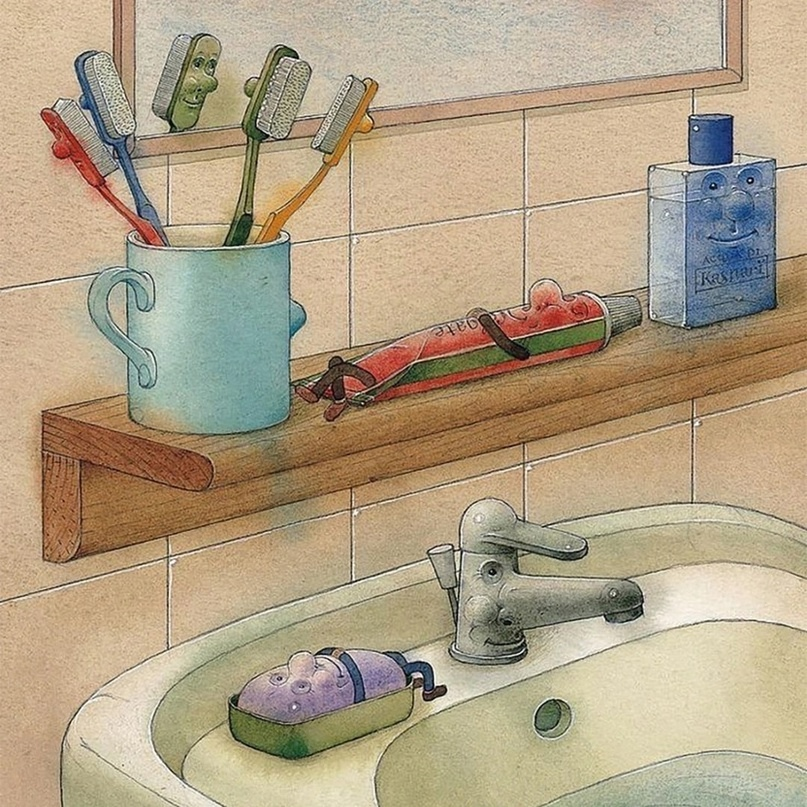Все притихли, каждый думал о своем. А потом раздался всхлип. Потом еще и еще - плакала большая синяя зубная щетка. Розовая соседка, поменьше ростом, утешала ее: