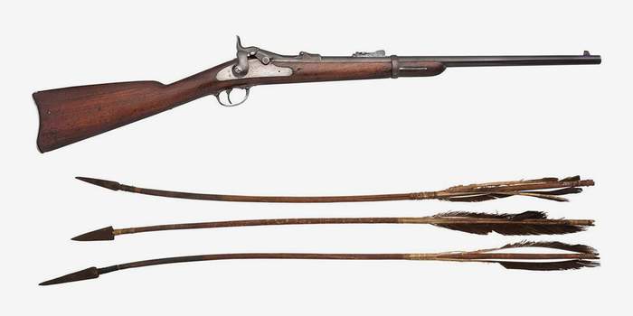 У американских солдат по штату были однозарядные карабины «Спрингфилд». Они были менее скорострельны, но обладали большей дальнобойностью. Да и будь у солдат «винчестеры», патроны бы закончились очень быстро. Кроме винтовок, у американцев были «кольты».