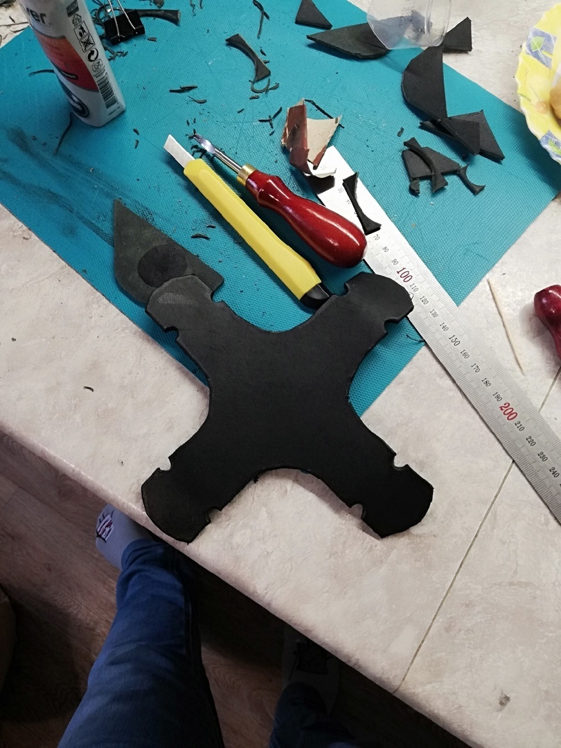 Фурнитуру не сфоткал, каюсь. Больше такое не повторится. Но там все просто, пряжки 2 шт ширина 3,4 см, четыре маленьких карабина, два побольше, куча двусторонних хольнитенов 9,7 мм диаметром, 4 ремки 40 мм, два полукольца 20 мм, два полукольца 40 мм да и вроде всё. Теперь сам процесс. Переносим с бумаги с помощью стержня крестовину, вырезаем, зашкуриваем, понимаем, что рамки сук такой же ширины как и шлейки. Беда. Тут на помощь и пришли отсекатели. Высекаем на местах изгиба, тем самым уменьшаем ширину. Ай да молодец. Выкрутился.