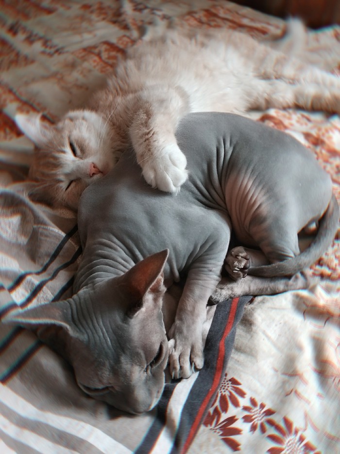 Сфинкса зовут Оззи(6 лет), а рыжего Персик(1,5 годика). Часто ссорятся, но спят всегда вместе, потому что лысому холодно, а Персик просто любит обнимашки)
