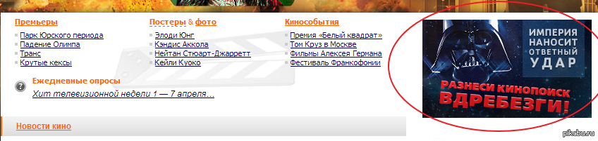 10 Berson Разносим кинопоиск! 12 лет назад Заходим на http://www.kinopoisk.ru/ и кликаем как на картинке. Я убил минут 10 :) Эта игрушка в честь 1го апреля. Сайт КиноПоиск Игры