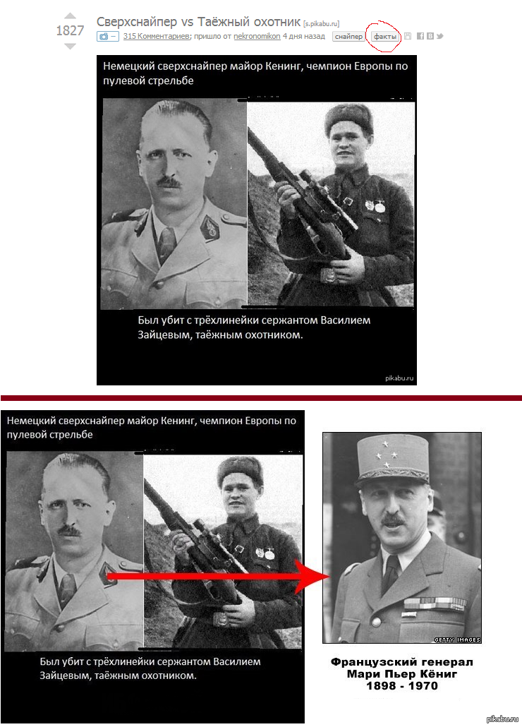 Василий Зайцев на самом деле убил Гейнца Торвальда, которого сам называл майором Кённигом. На фото изображён, предположительно, Мари Пьёр Кёниг, но некоторые его фото совсем не похожи на ту, что выдают за Торвальда.