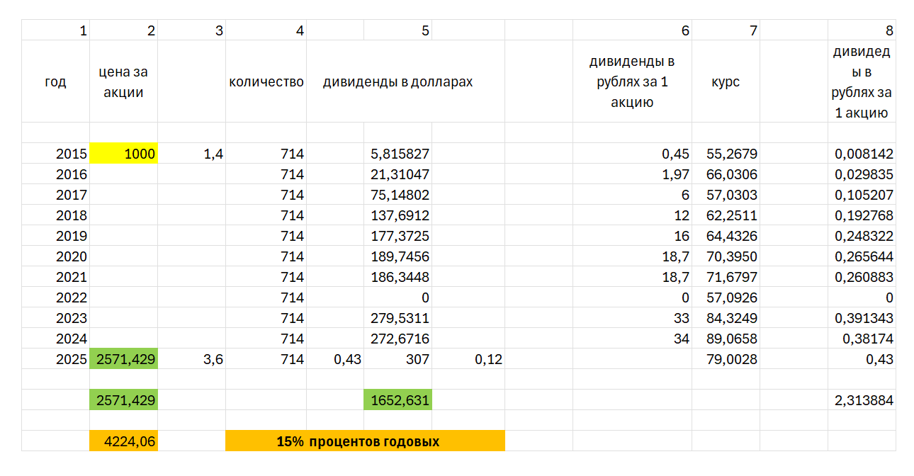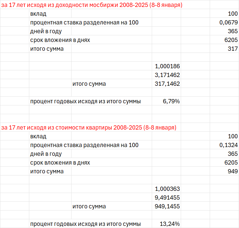 Поскольку я ранее анализировал сравнение инвестиций в недвижимость с индексом полной доходности мосбиржи (рис.1, та самая диверсификация о которой пишет аналитик) - и у меня получилось 6,79 и 13,24% в пользу недвижимости(расчет ниже на скриншоте), то в этот раз меня триггернуло проверить вышеуказанную информацию. Не поленился, сделал расчет доходности акций сбера на 1000 долларов (рис.2), о которых пишет Иван Данилов ака Crimson alter ( https://ruxpert.ru/Crimson_Alter)