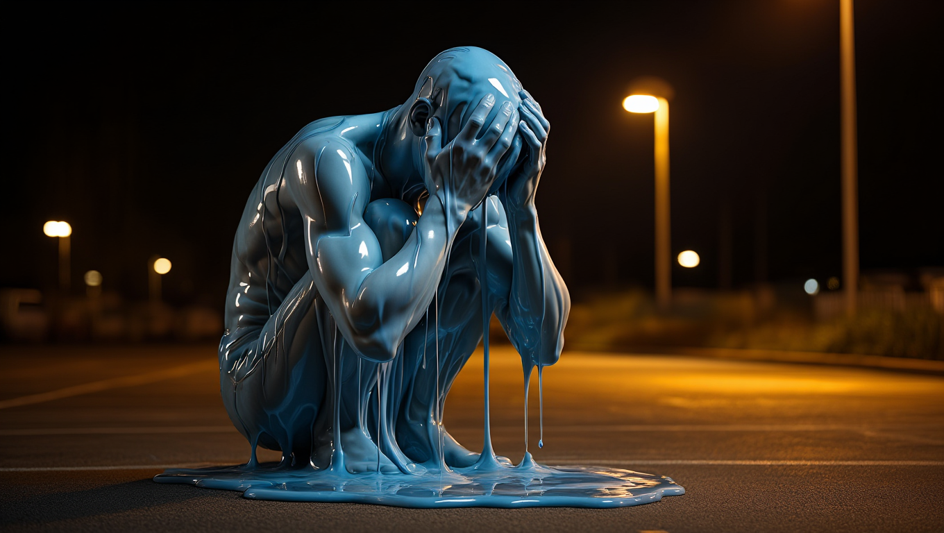 Промпт: A striking contemporary sculpture installed in a nighttime parking lot setting depicts a life-sized human figure in a crouching position with hands covering its face, created in a metallic blue-gray material with a high-gloss finish. The figure appears to be melting, with dramatic drips and pools forming beneath it, creating a powerful metaphorical statement. The sculpture is photographed from a low angle in medium shot, with artificial street lighting creating dramatic side illumination that emphasizes the glossy surface texture and liquid-like qualities of the piece. The background features warm glowing street lamps and a dark asphalt surface that reflects the ambient lighting. Professional art photography with dramatic artificial lighting and reflective surfaces shot at night.