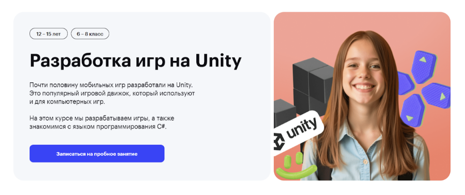 Содержание: направление частично повторяет некоторые предшествующие варианты. Речь о том, что ребятам предстоит освоить «Юнити» и кодинг на Си Шарпе.