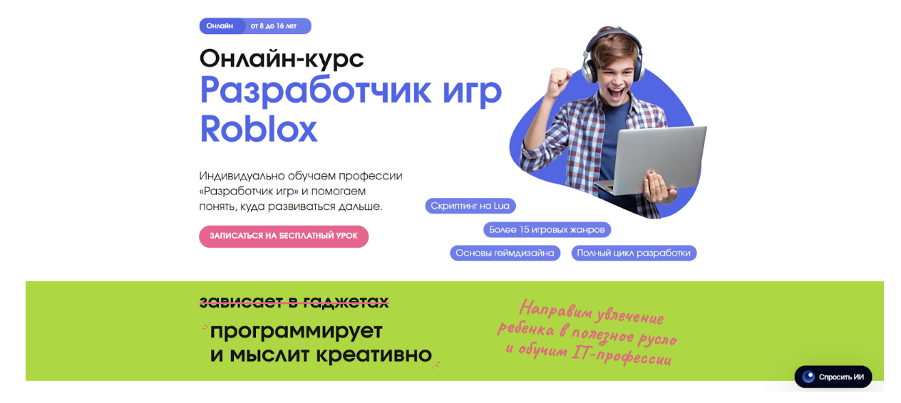 Содержание: траектория комплексная по той причине, что она объединяет два самостоятельных онлайн-курса. Один из них посвящен трехмерному моделированию на движке Roblox Studio, второй – программированию на скриптовом языке «Луа» и непосредственному созданию игр.
