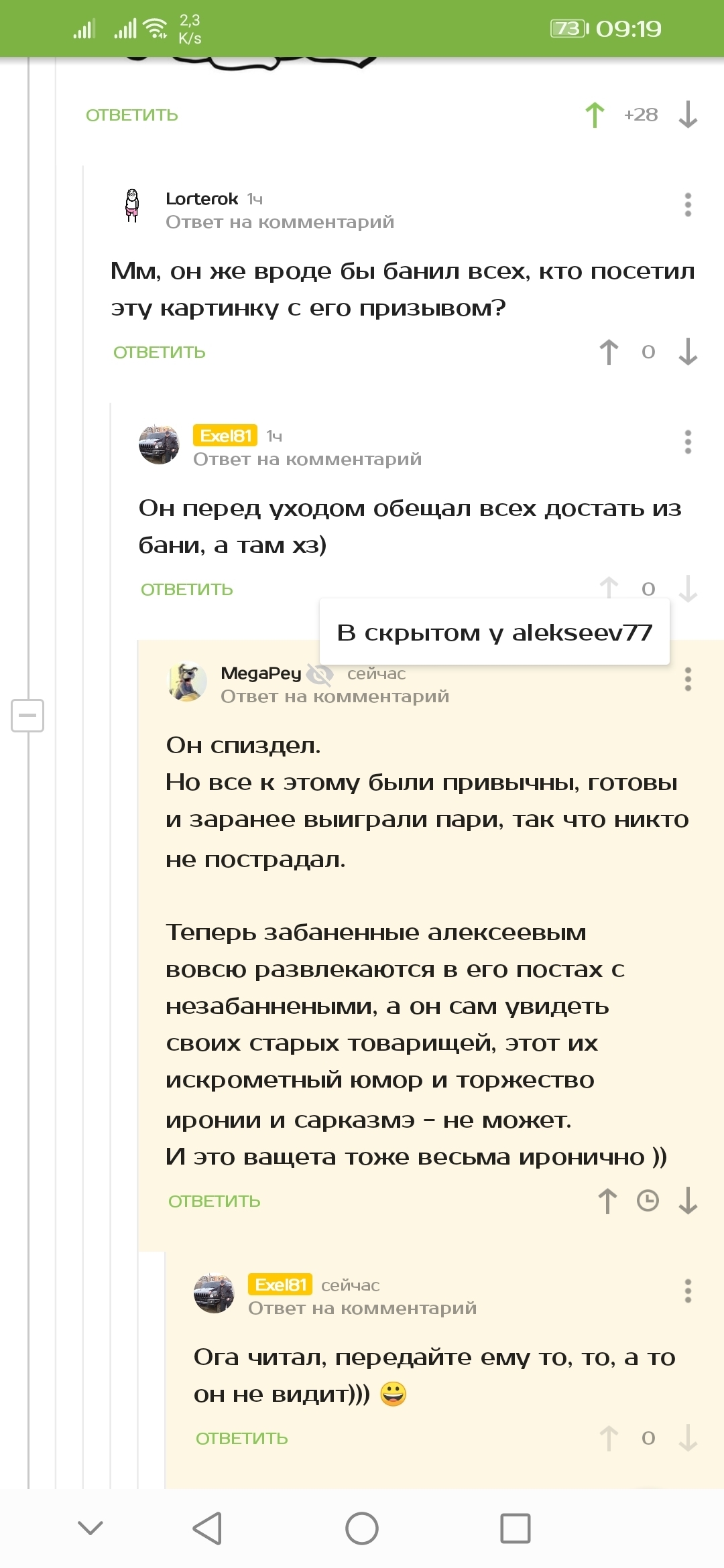 Теперь забаненные алексеевым вовсю развлекаются в его постах с незабаннеными, а он сам увидеть своих старых товарищей, этот их искрометный юмор и торжество иронии и сарказмэ - не может.