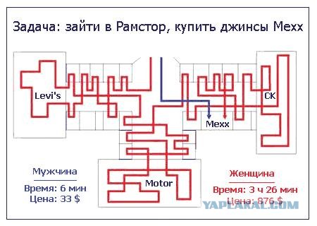 Просто у женщины не стоит задача быстро совершить покупку. От хождения по магазинам она получает удовольствие, поэтому и ходит по ним. Если бы ей это не нравилось, она так де, как и мужчина совершила бы быструю покупку