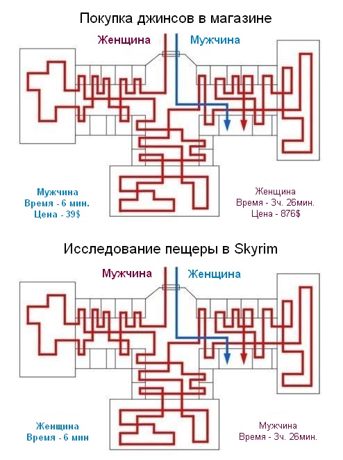 Скайрим - это РПГ, обычно дается квест, к примеру, убить главаря разбойников и забрать у него Меч Священных Пизлюдей. Местоположение данного разбойника отмечается в такой-то пещере. Игрок идет к этой пещере, заходит в нее и дальше варианты разделяются. Женщина якобы идет сразу напрямую к цели, выполняет квест и уходит, а мужчина якобы оббегает все закоулки в поисках дополнительных ништяков. От себя могу сказать, что почти все пещеры в Скайрим практически линейные и особо отворотов от прямого пути там нету, единственная разница может быть в том, что кто-то обыскивает все трупы убитых врагов, бочки и корзинки, кои в подземельях водятся в избытке, но на мой взгляд это зависит от состоятельности игрока, нужно ли ему собирать золото или нет. Вот как то так.