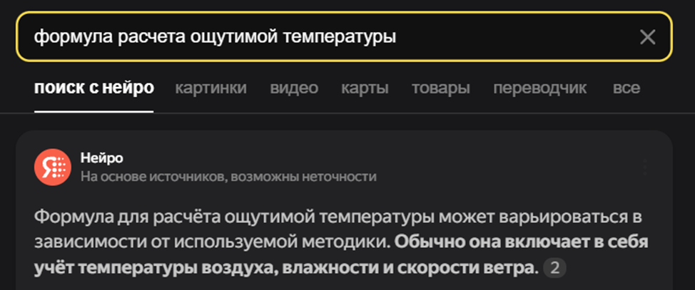 Теперь у нас есть база. А ещё мы знаем, что температура воздуха, влажность, скорость ветра и та самая ощутимая влажность — это все скалярные величины. И возможно где-то в интернете уже есть формулы для расчета этой самой величины.