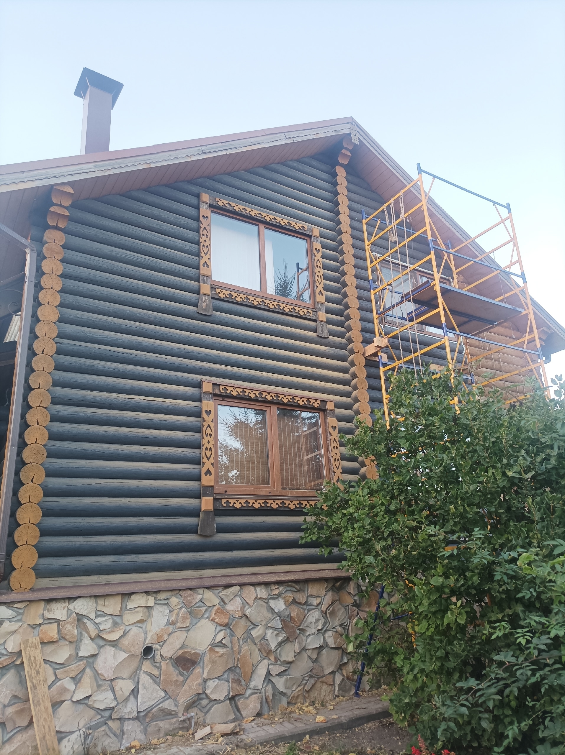 Здравствуйте, дорогие друзья! С вами снова я- гламурный блогер, кумир молодежи, гений, миллиардер и филантроп. Прошу прощения за то, что не выдал новую серию про покраску сруба- закопался в работе, да и погода не очень. До холодов пожалуй успею докрасить половину дома, остальное- на весну. Вот так это выглядит сейчас: