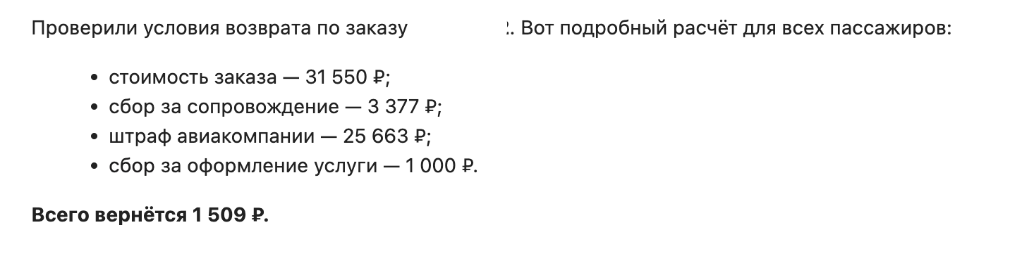 Поездка к сожалению сорвалась и пришлось воспользоваться возвратом авиабилетов. Нажал в заказе вернуть билеты, и спустя какое-то время на почту пришел ответ от авиасейлс с удивительным расчетом суммы возврата. Из 31 550 рублей они готовы вернуть только 1 509 рублей. За саму дополнительную услугу возврата билетов было уплачено больше.