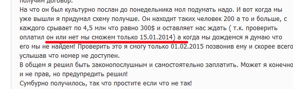 На что он был культурно послан до понедельника мол подумать надо. И вот когда мы уже вышли я придумал схему получше. Он находит таких человек 200 а то и больше, с каждого срывает по 4,5 млн что равно 300$ и оставляет нас ждать ( т.к. проверить оплатил он или нет мы сможем только 15.01.2014) а когда мы дождемся я думаю что его мы не найдем! Проверить это я смогу только 01.02.2015 позвонив ему и скорее всего услышав что номер не доступен.