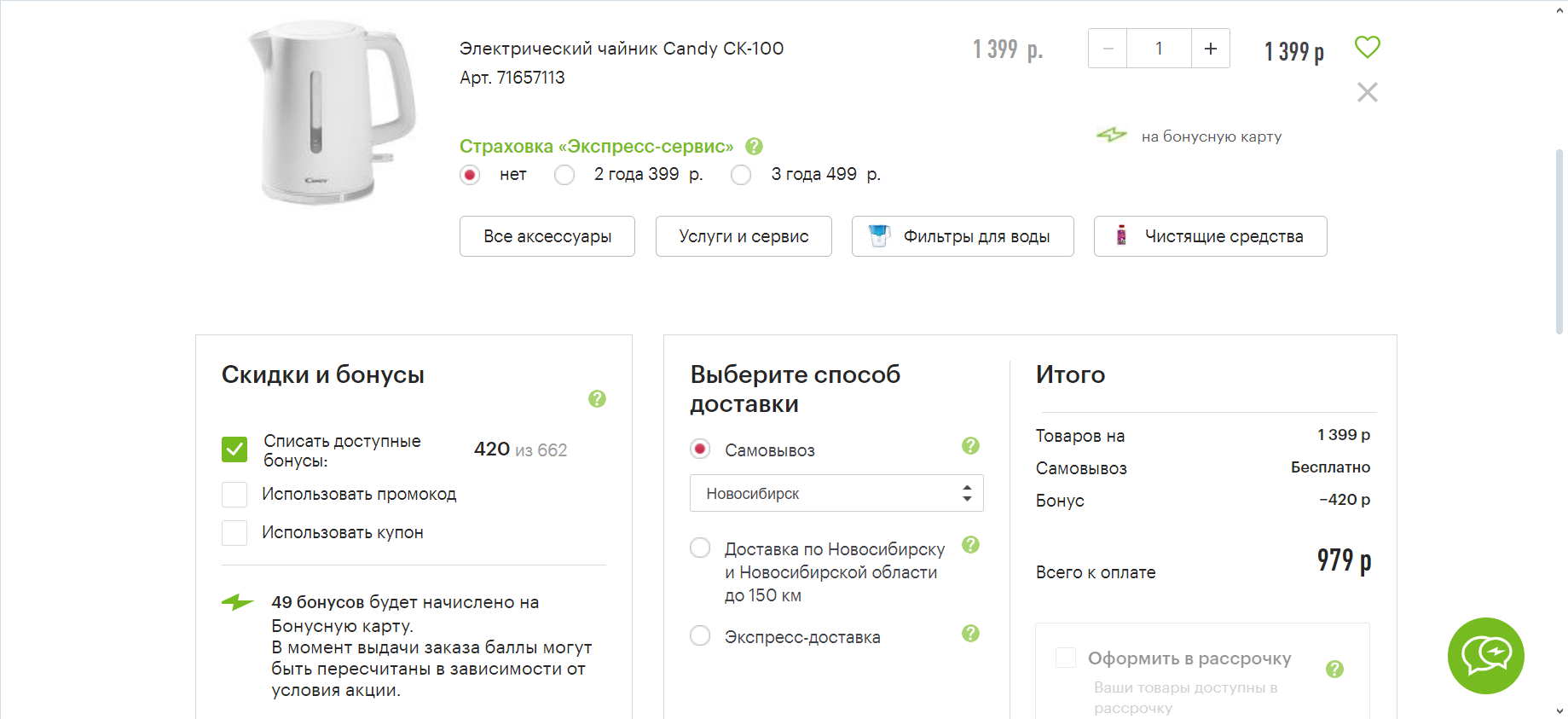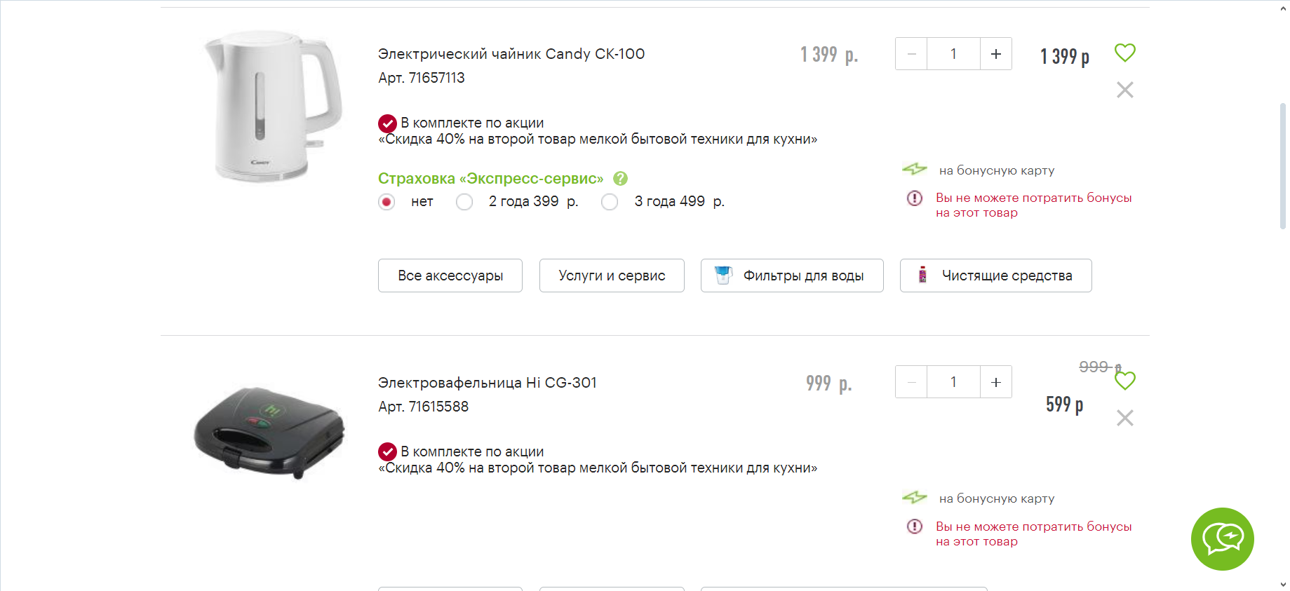 Озадачились подарками на рождество. Выбор пал на Эльдорадо и МэВидео, тем более там еще бонусы есть, магазины под боком, да еще и акцию обещают -40% на второй товар. Выбрали чайник и вафельницу, добавляю в корзину, скидка на второй товар есть, а бонусы списать нельзя.