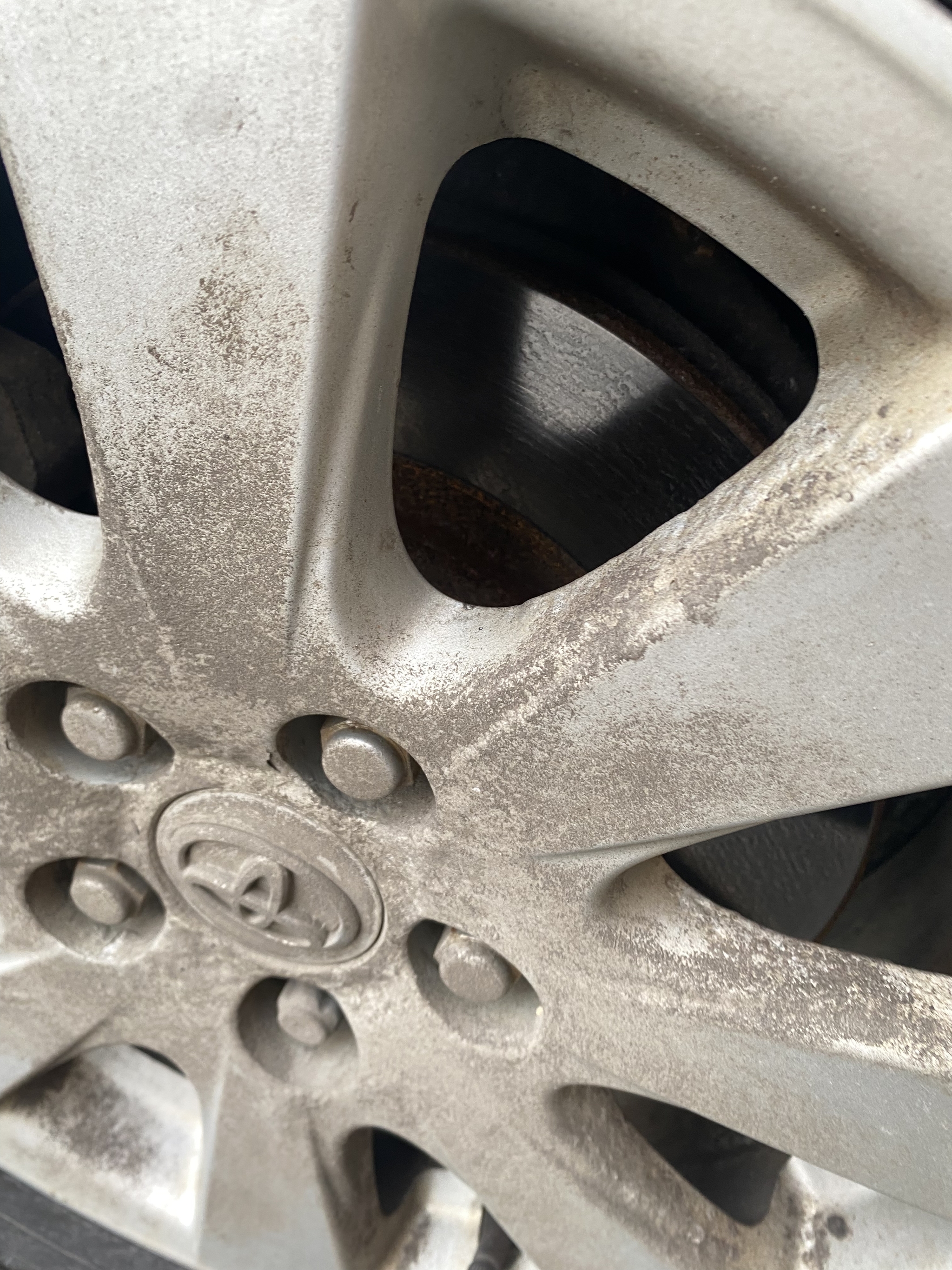 По моему это обычная грязь, поскольку она с солью, то жидкая и поэтому не замерзла, а высохла тонким слоем. Хорошей химией и давлением отмоется легко. У меня такие колеса постоянно, потому, что зима теплая.