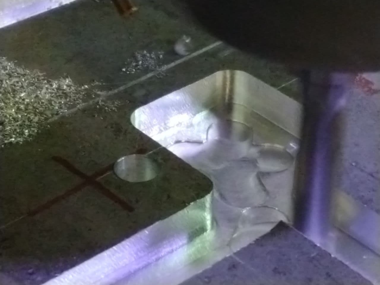 Как видим ниже - рабочая зона чиста от стружки, кроме места предварительного сверления, где у меня олеиновая к-та намазана была.