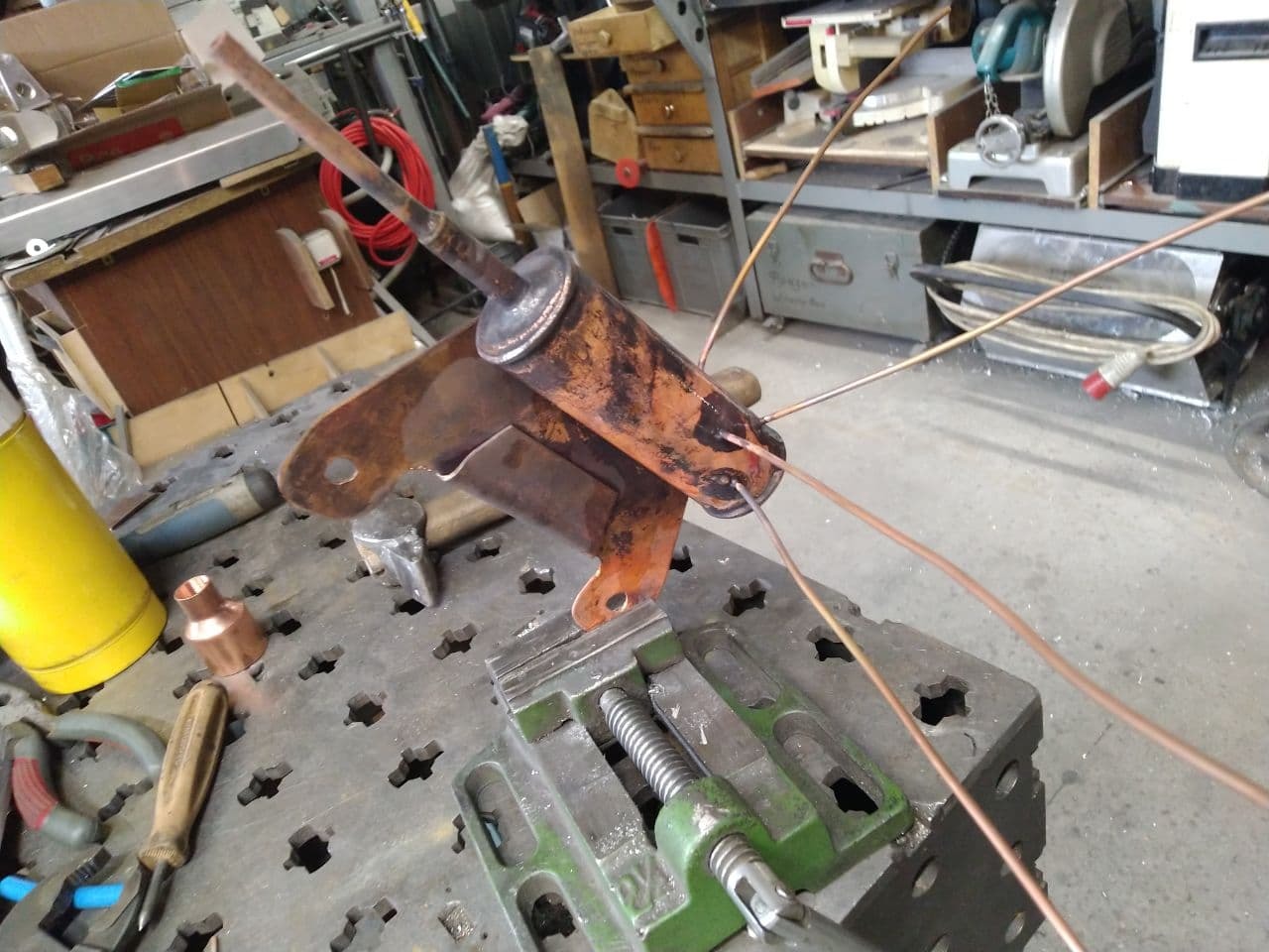 Рампилил вдоль, отжог и развернул в плоскую заготовку ещё кусок трубы, чтобы получить монтажную пластину, припаял её и четыре капиллярных трубки, опять же, используемых в холодилке.