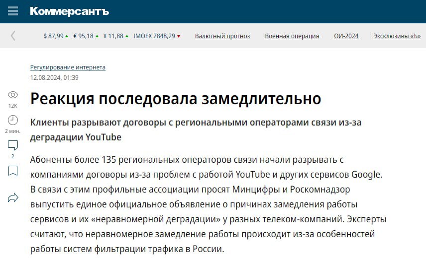 ❗️Абоненты более 135 региональных операторов связи начали разрывать с компаниями договоры из-за проблем с работой YouTube и других сервисов Google — «Коммерсант»
