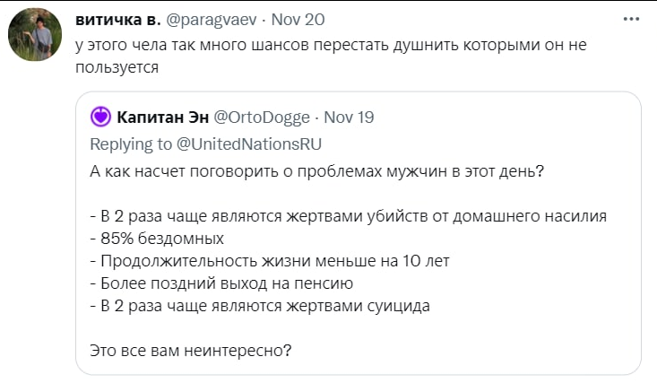 646 DELETED Реакция прогрессивных и толерантных... 3 года назад ...живущих в XXI веке фемок на твит о жесткой статистики проблем мужчин в официальный мужской день. X (Twitter) Скриншот Негатив Мат Оскорбление Мизандрия День Мужчин Длиннопост 18 17 4 3 Ещё 0