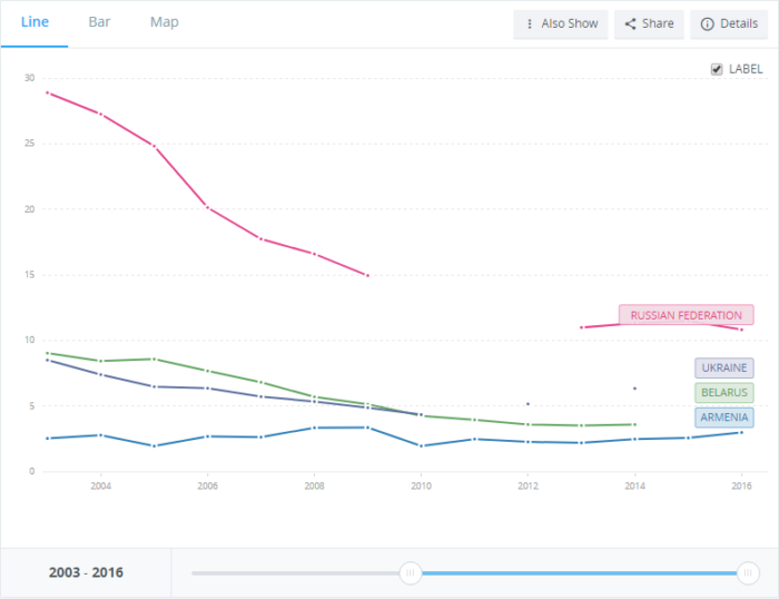 Данные от WorldBankGroup. Здесь есть пробелы, но все же их цифры несколько выше, чем то, что публикует ГИАЦ. Россия лидирует с кратным отрывом.