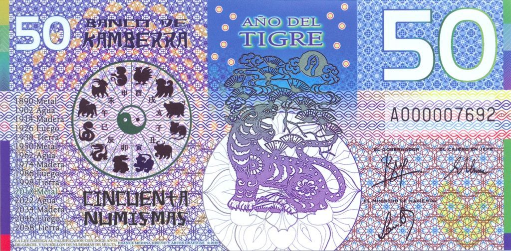 Несмотря на то, что страна выдуманная, с банкнотами все по-взрослому. Есть ряд защитных элементов. Из тех что визуально удалось определить не имея в руках реальной банкноты: микротекст, голограммы, защитная нить, рельефные метки для слабовидящих и что-то похожее на кольца Омрона. А если верить двум найденным описаниям банкнот от Banco de Kamberra —используются еще водяные знаки, скрытые изображения, светящаяся в ультрафиолете краска и много другое.