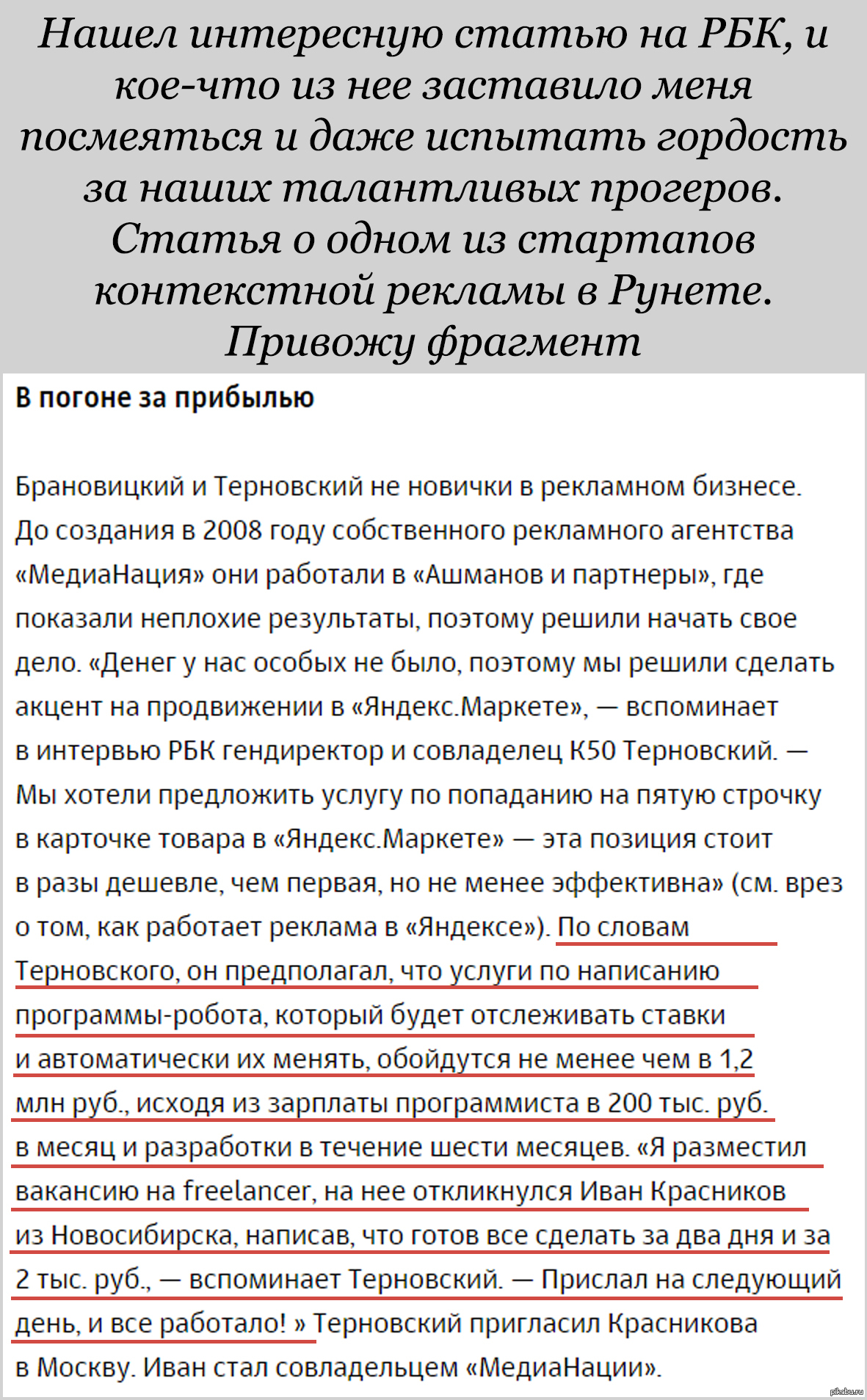 143 pro100god Реальность и ожидание в бизнесе контекстной рекламы :) Или про русских программистов. 10 лет назад сэкономил денег в 600 раз и времени в 60 раз. Материал из статьи РБК, ссылка: http://daily.rbc.ru/ins/own_business/14/05/2015/5551ede e9a794782e0af66f5 Ожидание и реальность Бизнес Стартап Программист Красавцы