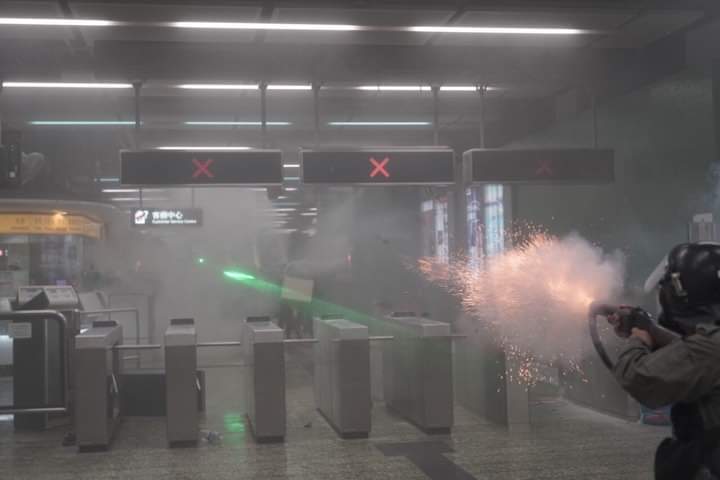 Полиция Гонконга распыляет слезоточивый газ на действующей станции метро, в качестве меры борьбы с протетующими.