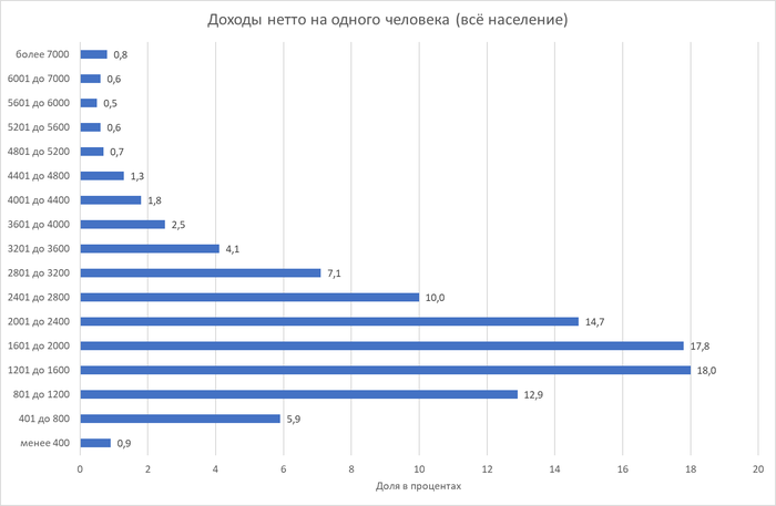 Видно, что больше трети населения в месяц имеет менее 1600 евро на руки на человека. По немецким меркам это, конечно, не так много. А пятая часть населения вообще живёт менее, чем на 1200 евро в месяц на человека. В переводе на рубли это может показаться приличной суммой, но с учётом немецких цен на жильё, транспорт и коммунальные услуги, 1200 евро – это впритык. (В конце поста я приведу пример моих личных расходов, чтобы было понятнее.)